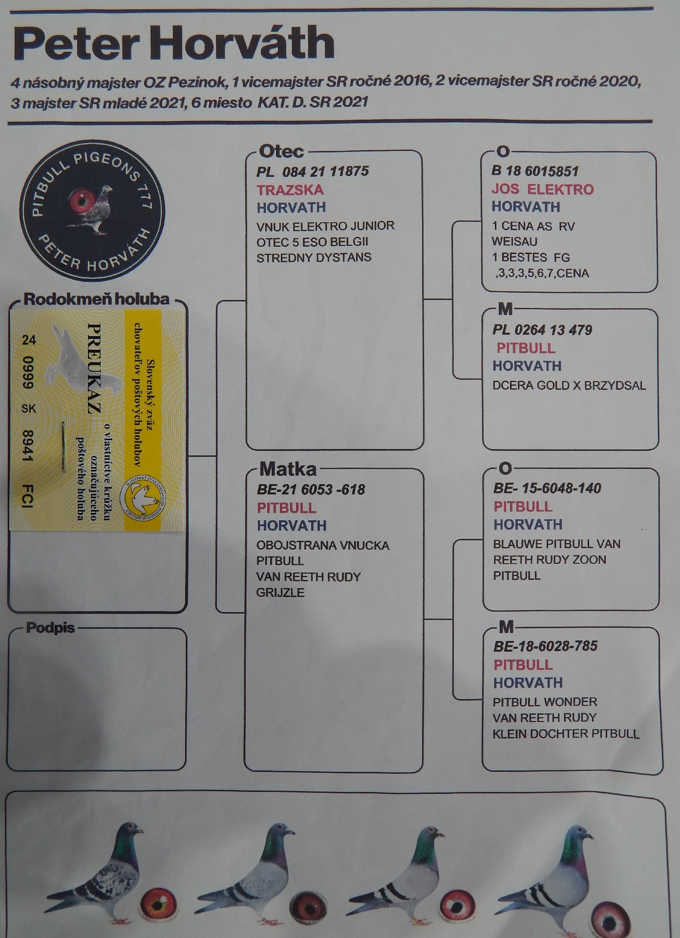 Zdravíme Vás športoví priatelia. V tejto aukcii Vám ponúkame holubov z nášho chovu. V sezóne 2013 - 7 x 1.cena v OZ, 2014 - 7 x 1.cena v OZ, 2015 - 7 x 1.cena OZ, 2017 - 4 x 1.cena v OZ, 2018 - 4 x 1.cena, 2019 - 11 x 1.cena, 2020 - 11 x 1.cena v OZ, 2021 – 9 x 1.cena v OZ, 2022 – 6 x 1.cena v OZ, 2023 - 7 x 1.cena v OZ, 2024 - 8 x 1.cena v OZ, 2025 - 11 x 1.cena v OZ. Na olympiádach reprezentovalo Slovensko 12 našich holubov.