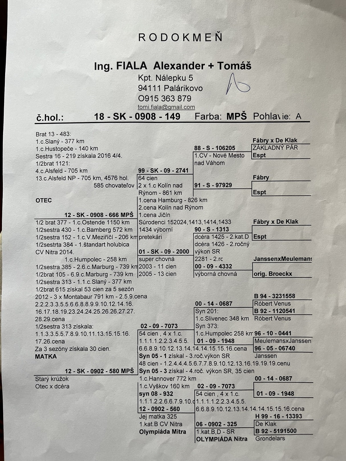 Vážený chovatelia, z rodinných dôvodov ponúkam na predaj všetky moje poštové holuby so zameraním na dlhé trate. Chov bol postavený na holuboch rodiny Poláškových z Českej republiky (línia Verhellen) ale aj iných domácich i zahraničných úspešných chovateľov. Chovu a pretekaniu s poštovými holubami som so synom Tomášom začal v roku 2012 do roku 2018 v OZ Kežmarok a 2019-2020 v OZ Poprad. Našim najlepším výsledkom bola účasť na Olympiáde Poznaň 2019 s holubom v kategórii Šport B, ktorí sa predáva v tejto dražbe. Ďakujem.