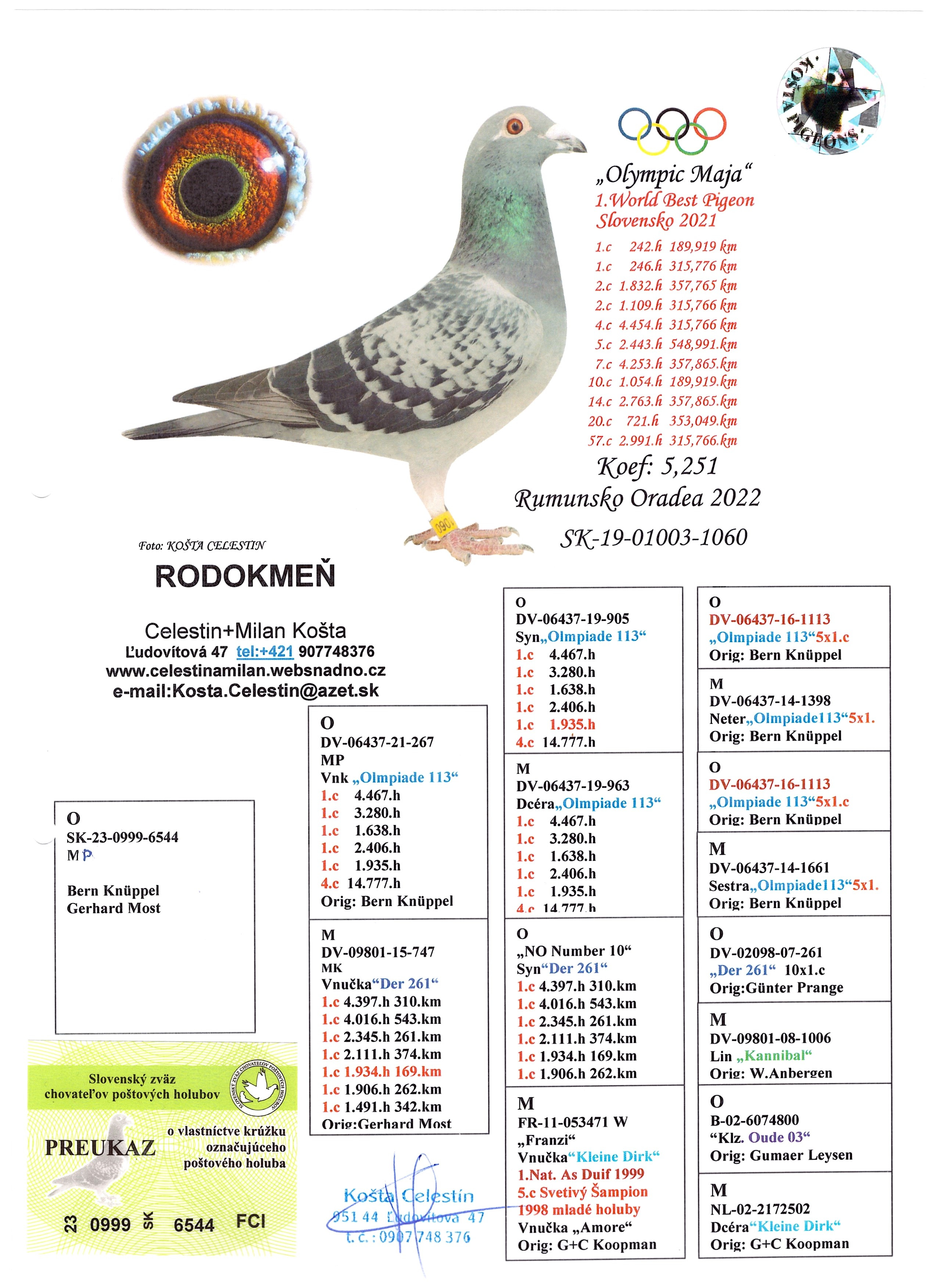 Popis: Otec holuba je vnuk Blue Dream 1.Eso Belgie 10x1.cena a Big Boss 1.holub sveta šport B Olympiada Nitra