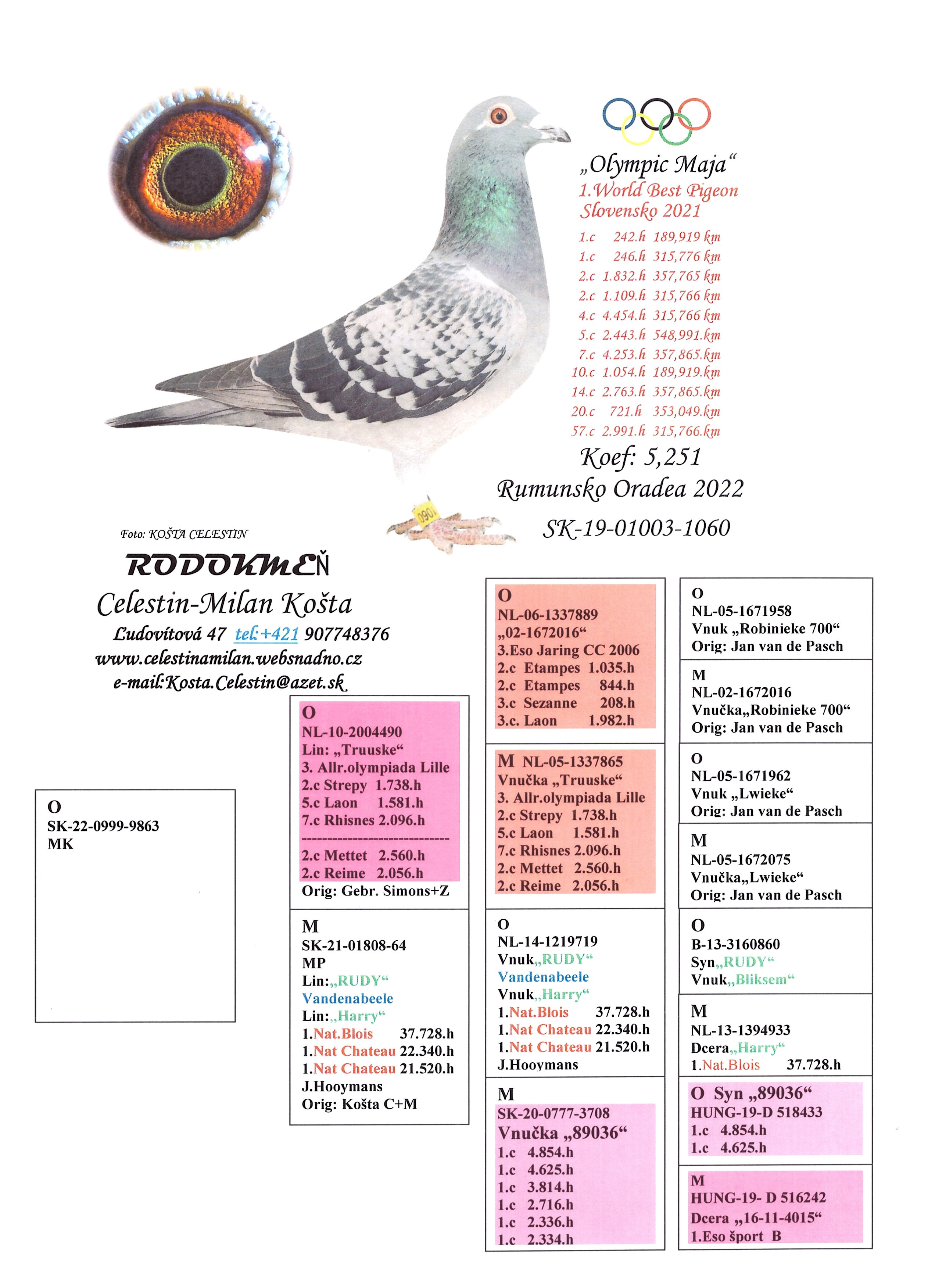 Popis: Ponukaná holubica je vnučka Super Milion 2.Eso Belgie stredné trate 2008.Matka vedie krv Olympic Martin+Olympic Leo 241 ktorého kúpil Eijerkamp