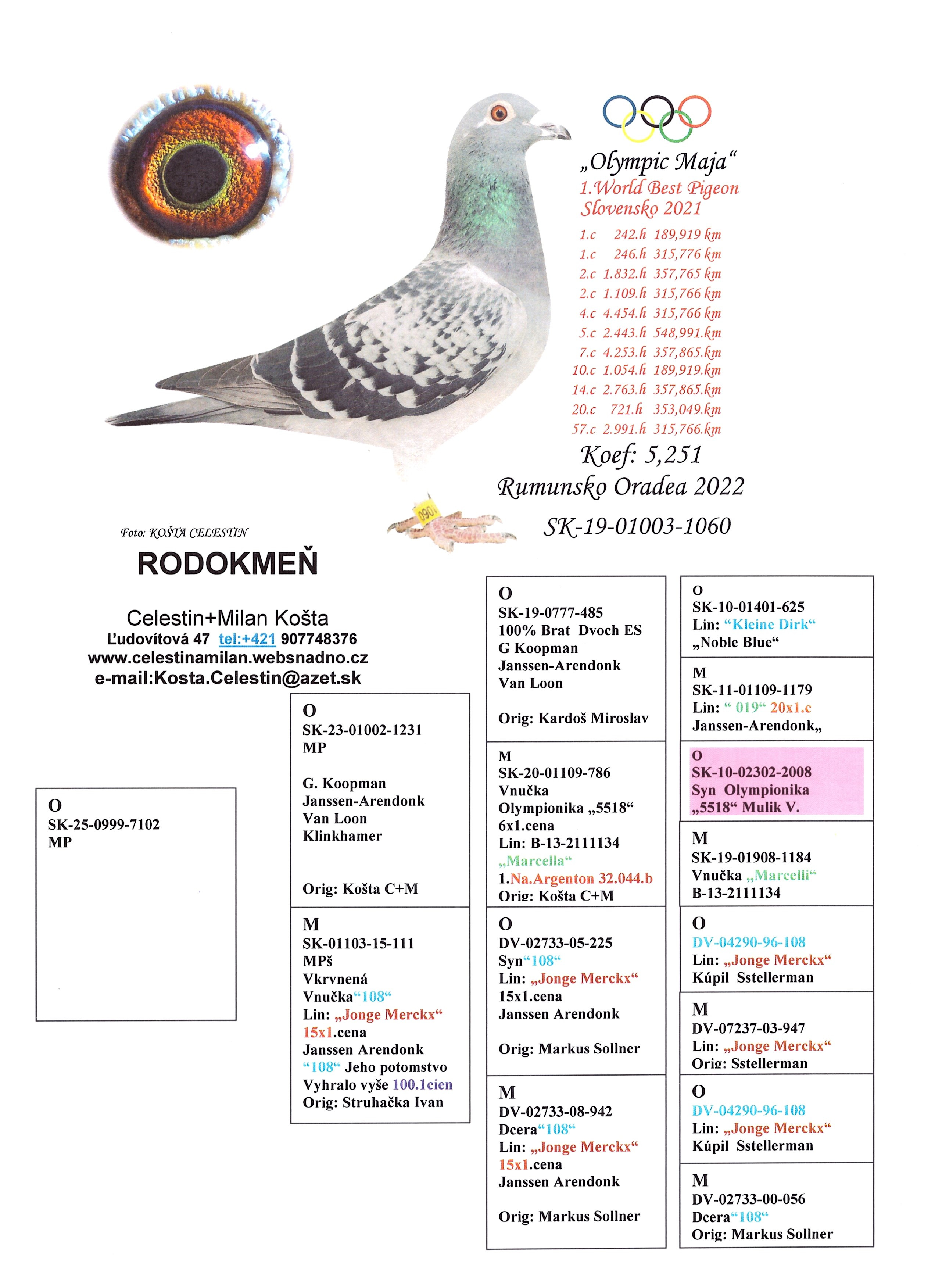 Popis: Otec holuba je orig: Kardoš Miroslav majster OZ Pezinok 2024 Janssen Koopman,matka je vnučka Olympionika 443 orig: Bachár Pavol Janssen Koopman