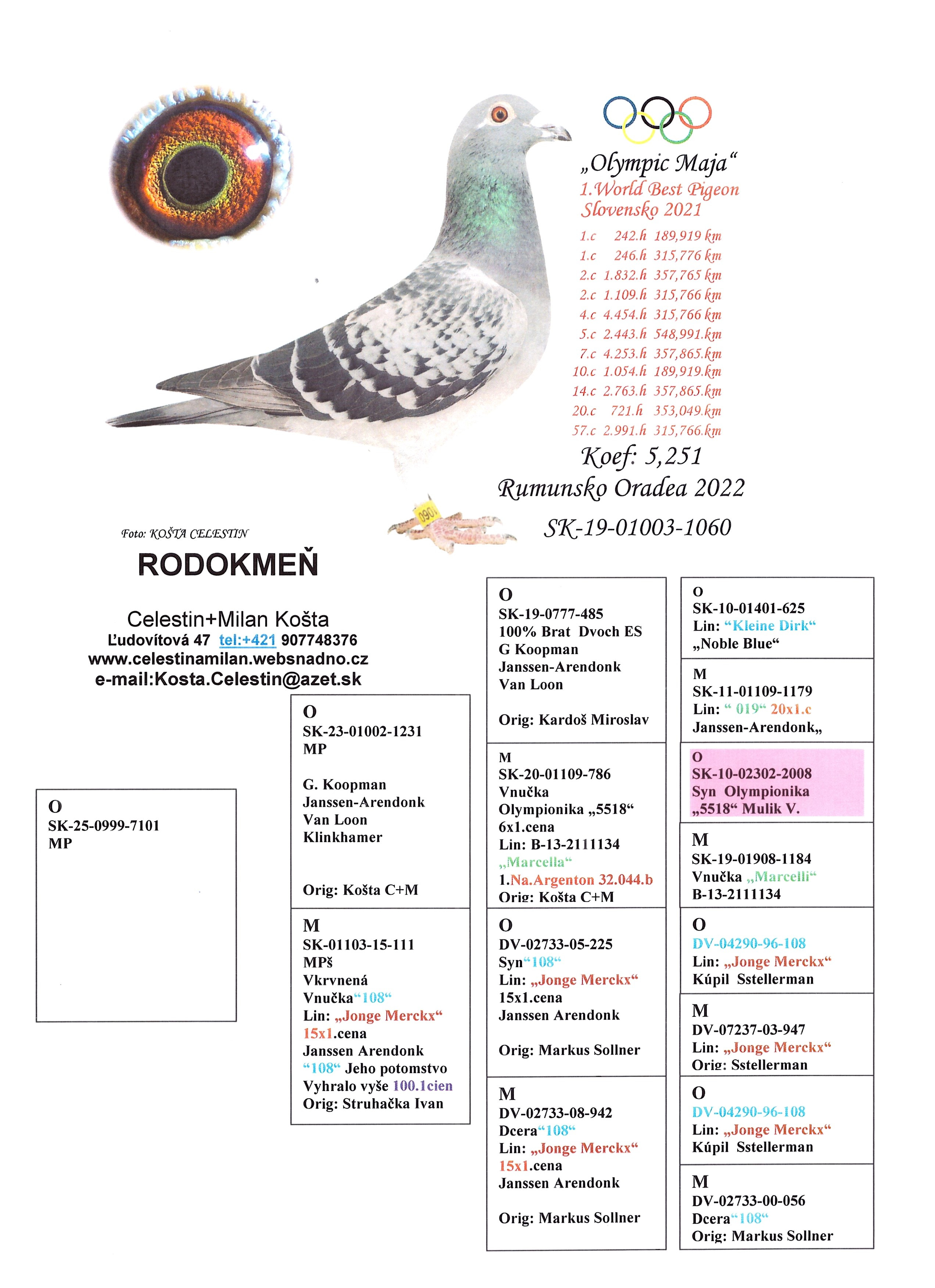 Popis: Ponukaná holubica je vnučka Super Milion 2.Eso Belgie stredné trate 2008.Matka vedie krv Olympic Martin+Olympic Leo 241 ktorého kúpil Eijerkamp
