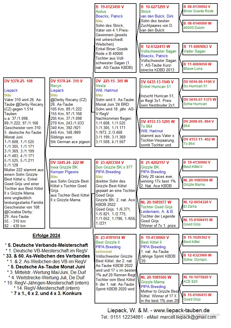 Otec a syn, Wolfgang (66 rokov) a Marcell (47 rokov), už mnoho rokov veľmi úspešne pretekajú s holubami v regióne Berlín-Brandenbursko. Lietajú zo západu a prekonávajú vzdialenosti až do približne 600 km. Ich najväčší úspech prišiel v roku 2024 s ich 5. miestom v nemeckom šampionáte (ďalšie úspechy nájdete v dodatku). Pravidelne dosahujú popredné umiestnenia v individuálnych pretekoch a rôznych šampionátoch na regionálnej a národnej úrovni.