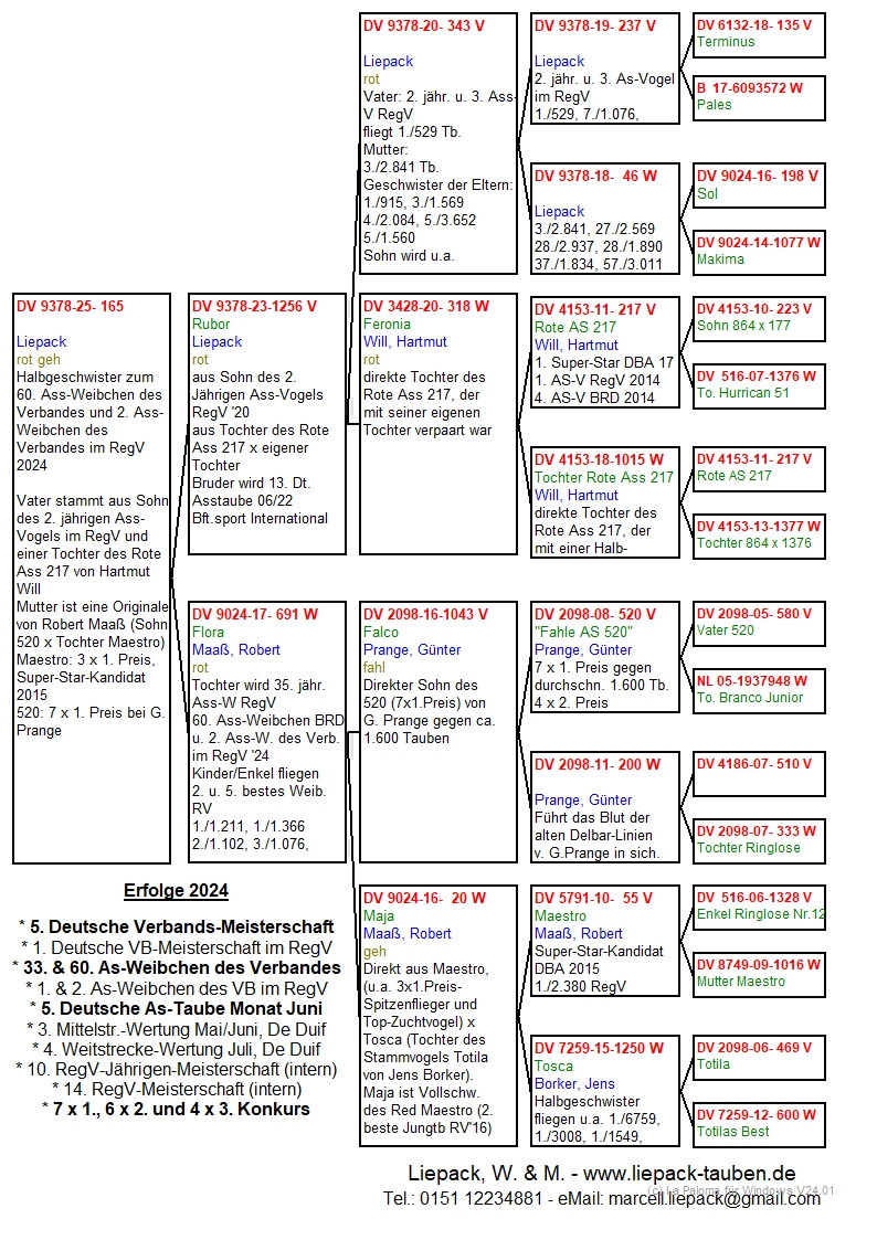 Otec a syn, Wolfgang (66 rokov) a Marcell (47 rokov), už mnoho rokov veľmi úspešne pretekajú s holubami v regióne Berlín-Brandenbursko. Lietajú zo západu a prekonávajú vzdialenosti až do približne 600 km. Ich najväčší úspech prišiel v roku 2024 s ich 5. miestom v nemeckom šampionáte (ďalšie úspechy nájdete v dodatku). Pravidelne dosahujú popredné umiestnenia v individuálnych pretekoch a rôznych šampionátoch na regionálnej a národnej úrovni.