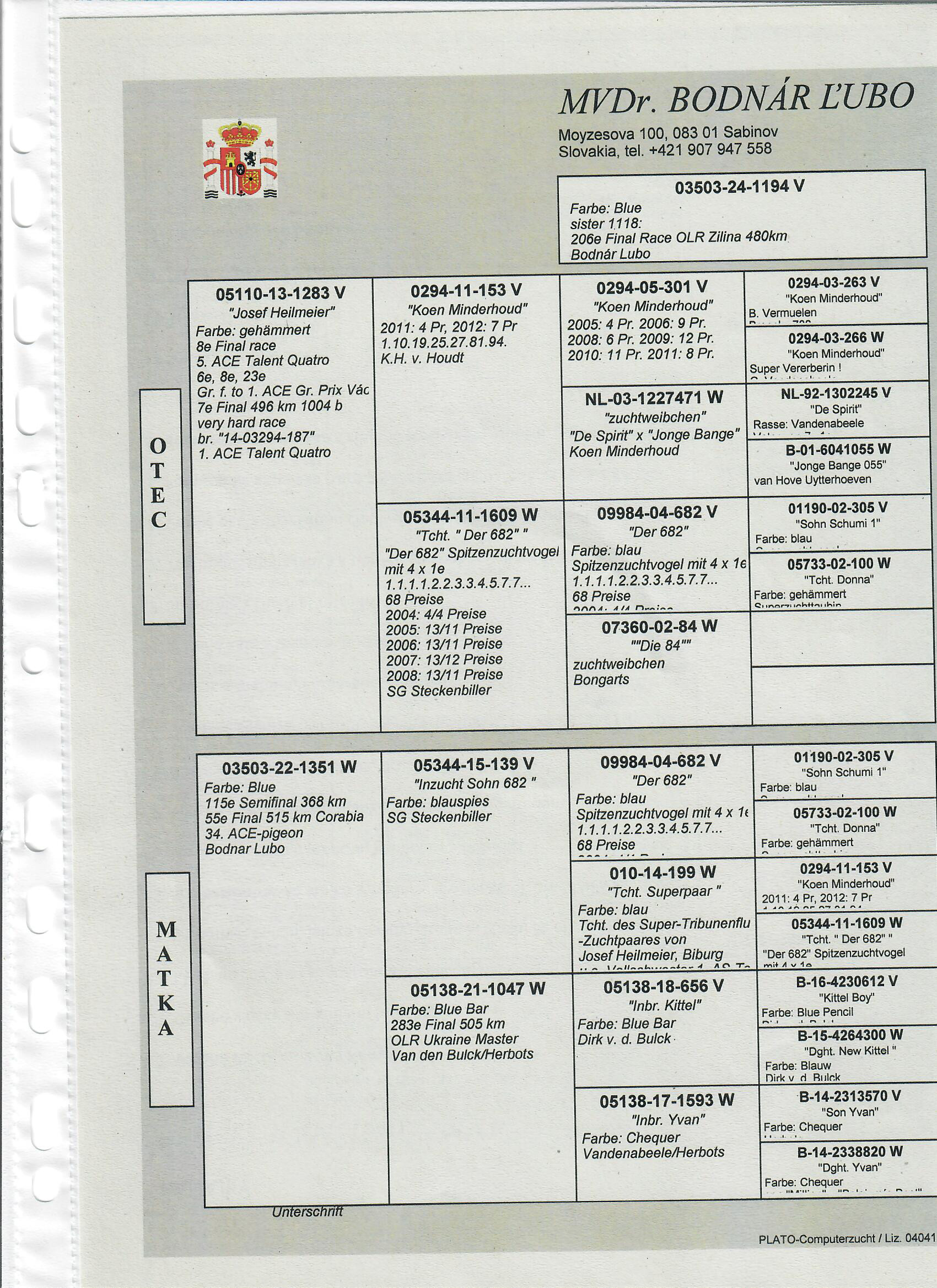 Popis: otcom holubice je orig Karl Hofmann, líia W. de bruin, matkou je holubica a. Meijbom z TS Tessaloniki v Gréckui