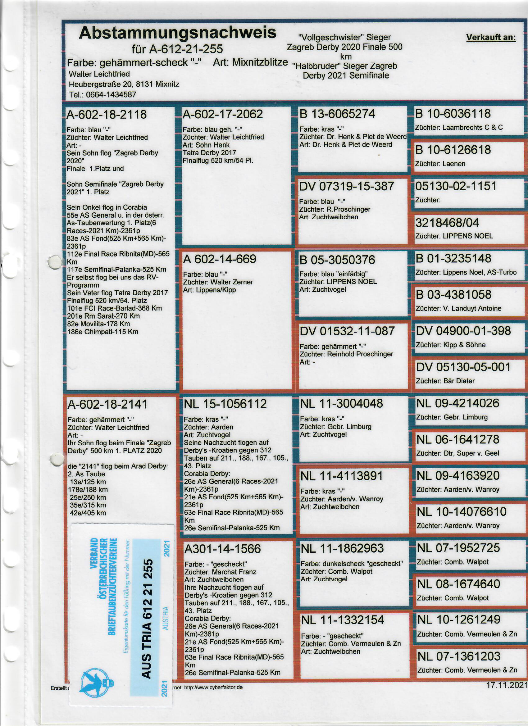 Popis: otcom tohto holuba je "1283"Josef Heilmeier, 5. ESO Talent Quatro a výborný chovný holub. Je starým otcom 1. ESA Grand Prix Vác, jeho priamy brat "187" je 1. ESO holubom talent Quatro a super chovný holub. Matkou holuba je "1351"-55e Final a 34. ES