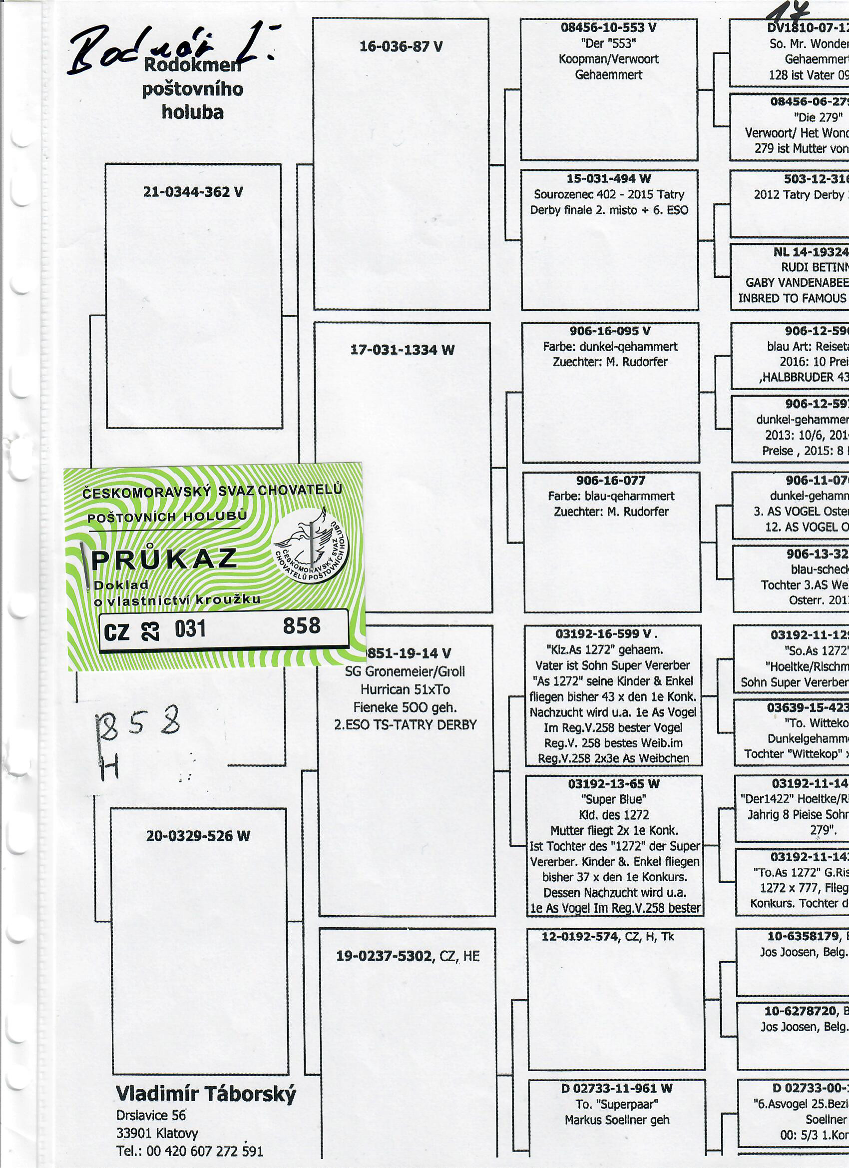 Popis: otcom holubice je orig Karl Hofmann, líia W. de bruin, matkou je holubica a. Meijbom z TS Tessaloniki v Gréckui