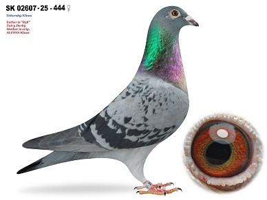 Popis: otcom tohto holuba je "1283"Josef Heilmeier, 5. ESO Talent Quatro a výborný chovný holub. Je starým otcom 1. ESA Grand Prix Vác, jeho priamy brat "187" je 1. ESO holubom talent Quatro a super chovný holub. Matkou holuba je "1351"-55e Final a 34. ES