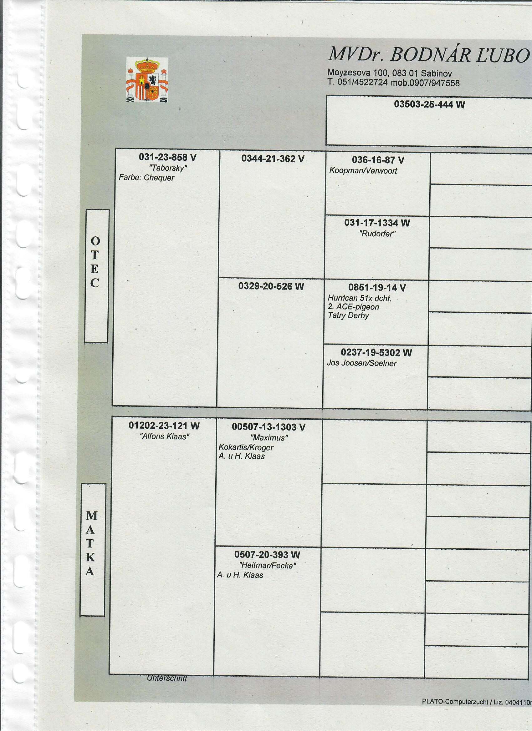 Popis: otcom holubice je orig Karl Hofmann, líia W. de bruin, matkou je holubica a. Meijbom z TS Tessaloniki v Gréckui