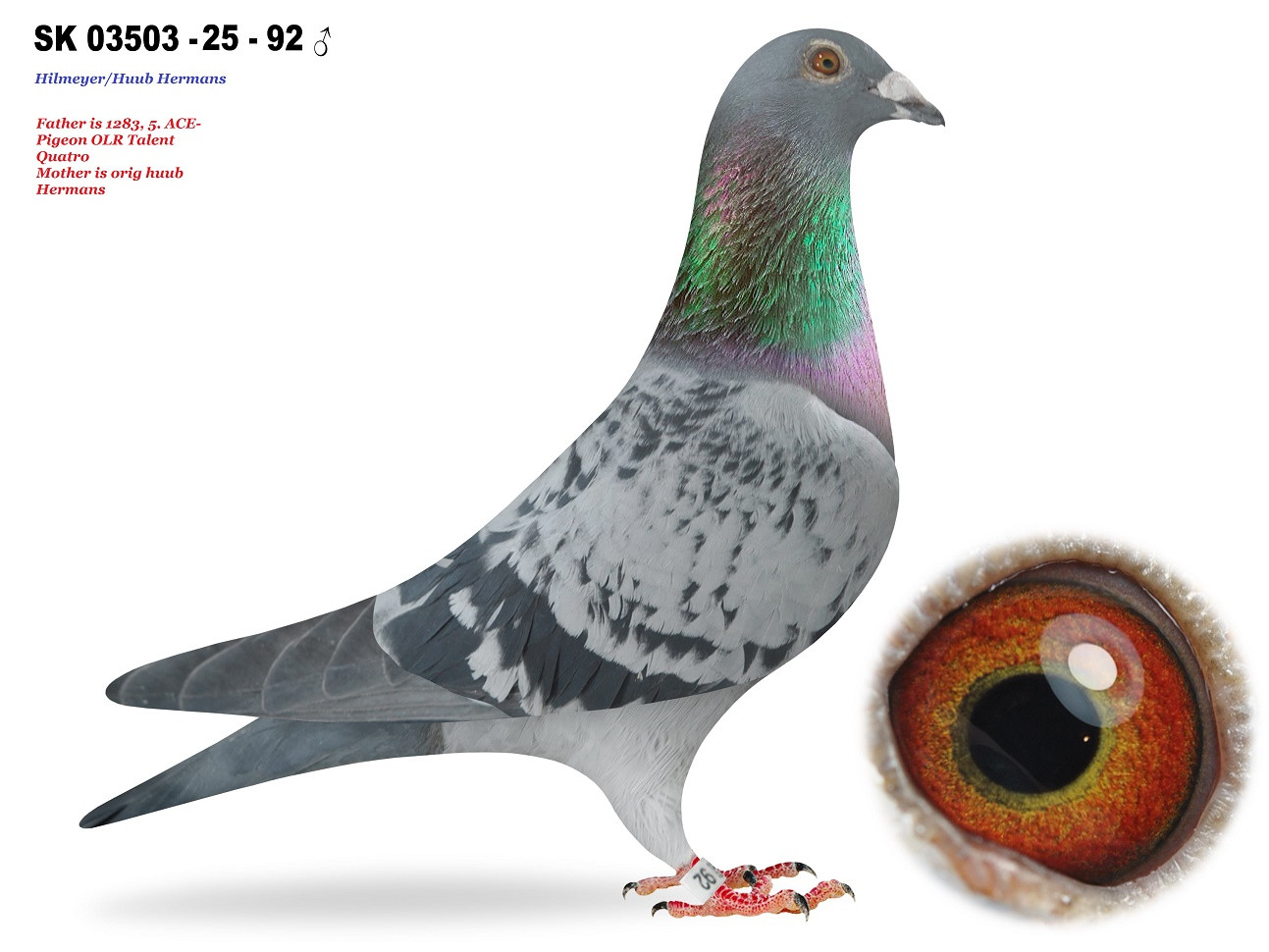 Popis: otcom tohto holuba je "1283"Josef Heilmeier, 5. ESO Talent Quatro a výborný chovný holub. Je starým otcom 1. ESA Grand Prix Vác, jeho priamy brat "187" je 1. ESO holubom talent Quatro a super chovný holub. Matkou holuba je "1351"-55e Final a 34. ES