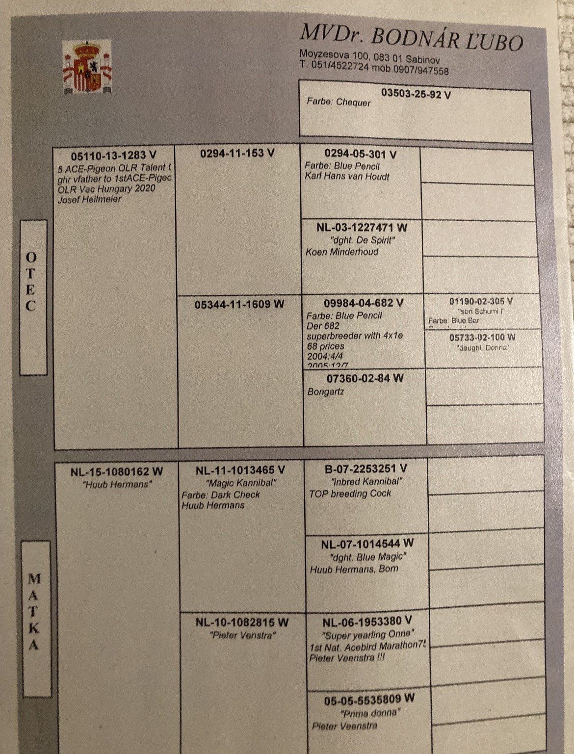 Popis: otcom holubice je orig Karl Hofmann, líia W. de bruin, matkou je holubica a. Meijbom z TS Tessaloniki v Gréckui