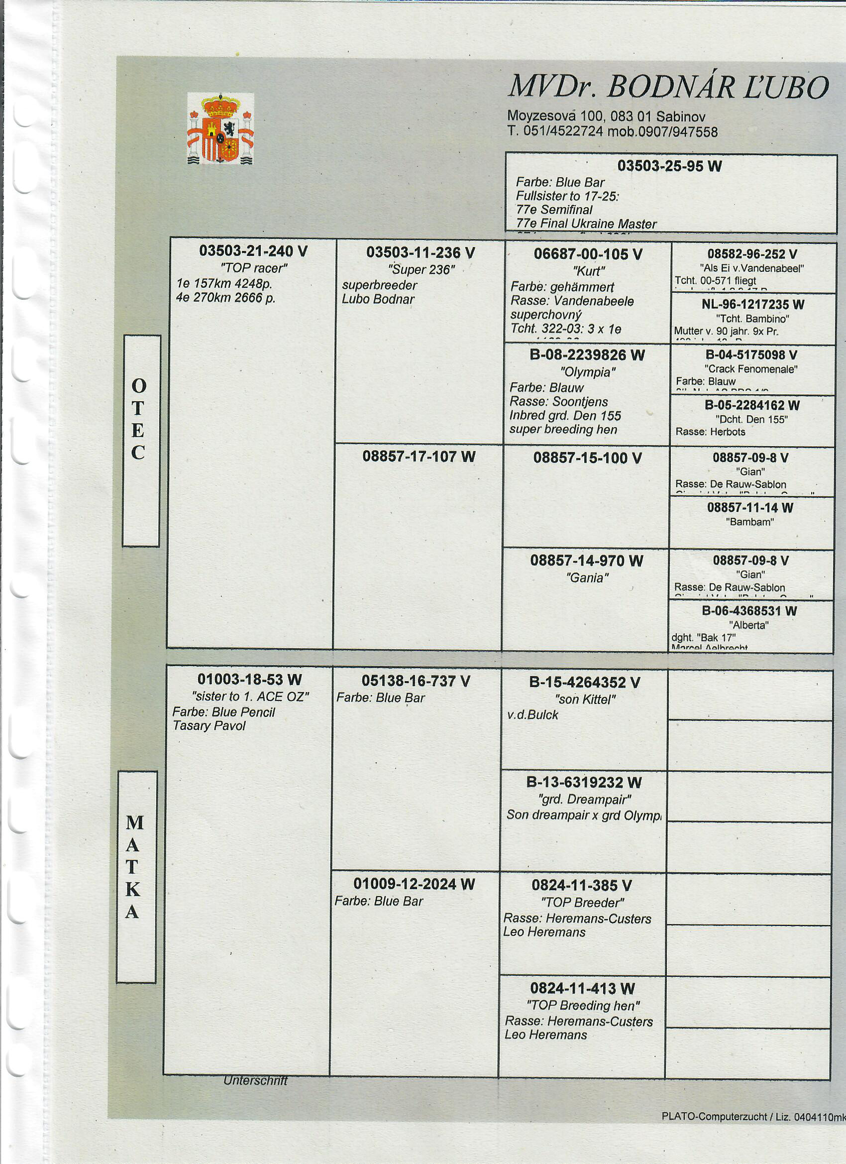 Popis: otcom holubice je orig Karl Hofmann, líia W. de bruin, matkou je holubica a. Meijbom z TS Tessaloniki v Gréckui
