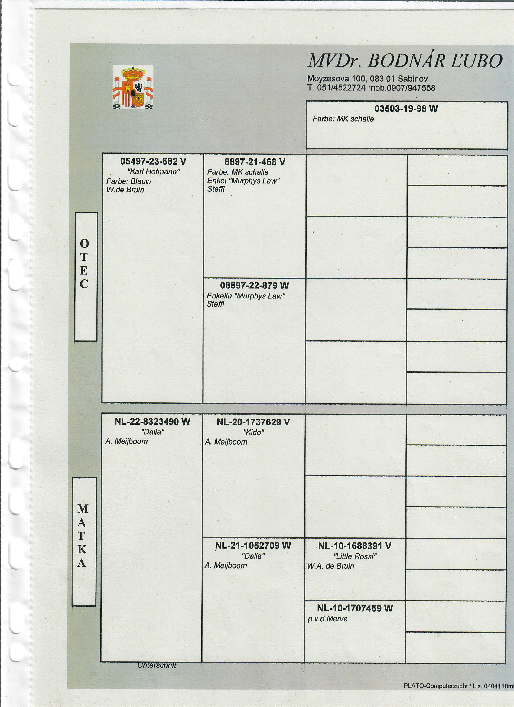 Popis: priama sestra he "17",77e, Semifinal, 77e final Ukraine master. otec je špičkový závodník "240", makou je ha 53, orig. Pavol Tasáry