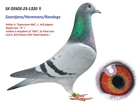 Popis: otcom tohto holuba je "1283"Josef Heilmeier, 5. ESO Talent Quatro a výborný chovný holub. Je starým otcom 1. ESA Grand Prix Vác, jeho priamy brat "187" je 1. ESO holubom talent Quatro a super chovný holub. Matkou holuba je "1351"-55e Final a 34. ES