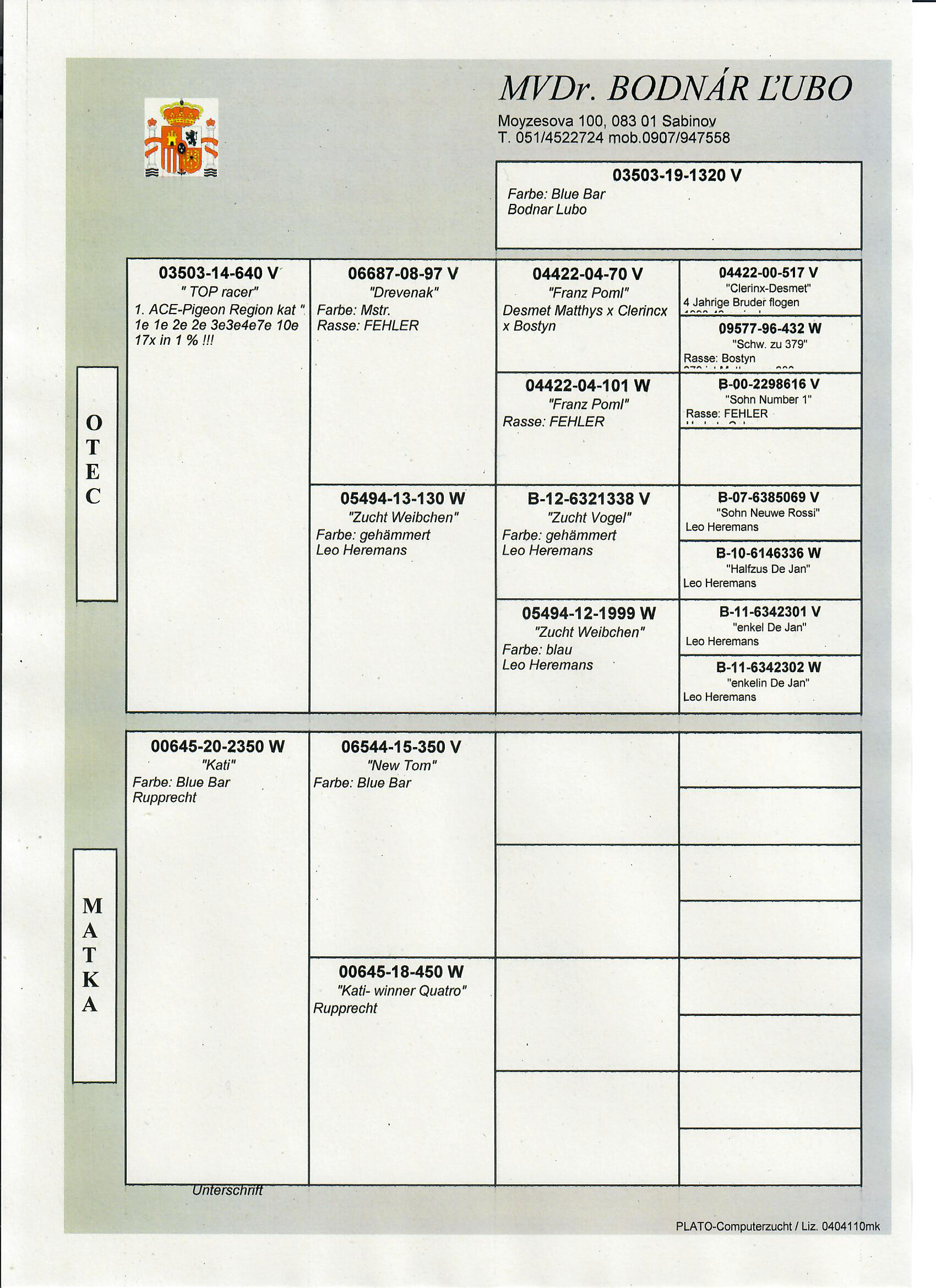 Popis: otcom holubice je orig Karl Hofmann, líia W. de bruin, matkou je holubica a. Meijbom z TS Tessaloniki v Gréckui