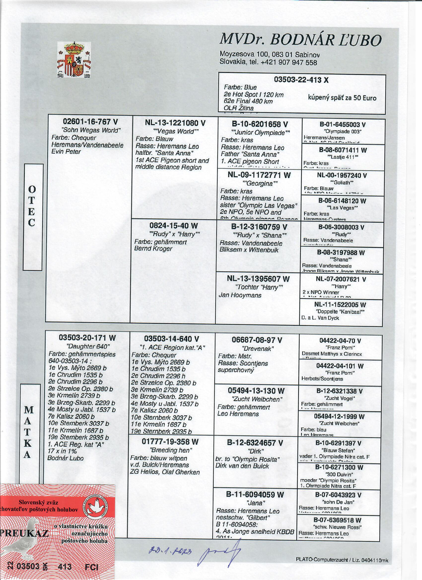 Popis: otcom holubice je orig Karl Hofmann, líia W. de bruin, matkou je holubica a. Meijbom z TS Tessaloniki v Gréckui