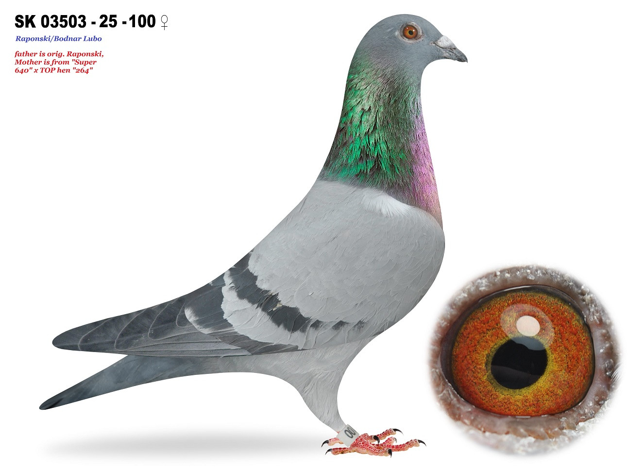 Popis: holub je synom "Ramirez"vnuk "Den Euro" orig. Eijerkamp, matkouje dcéra dvoch výnimočných pretekárov