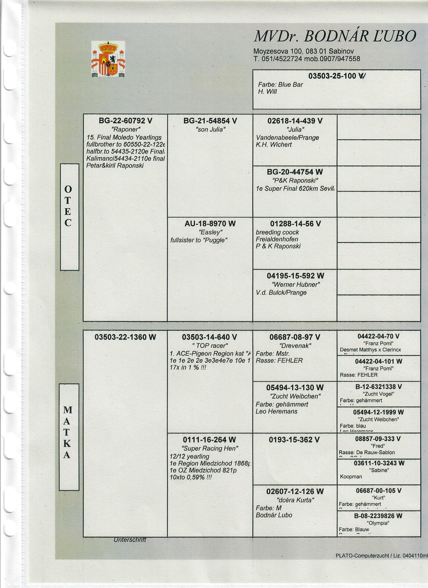 Popis: Otcom holuba je "665", vynikajúci závodník, 11x do 1%!!. druhé ESO Sprint region, matkouje dcéra 1. ESA Regionu