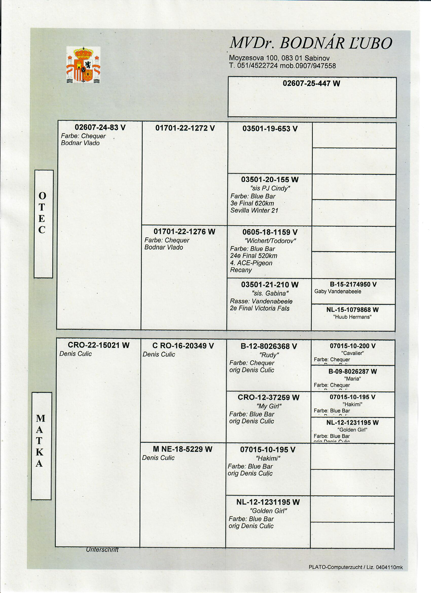 Popis: otcom holubice je orig Karl Hofmann, líia W. de bruin, matkou je holubica a. Meijbom z TS Tessaloniki v Gréckui