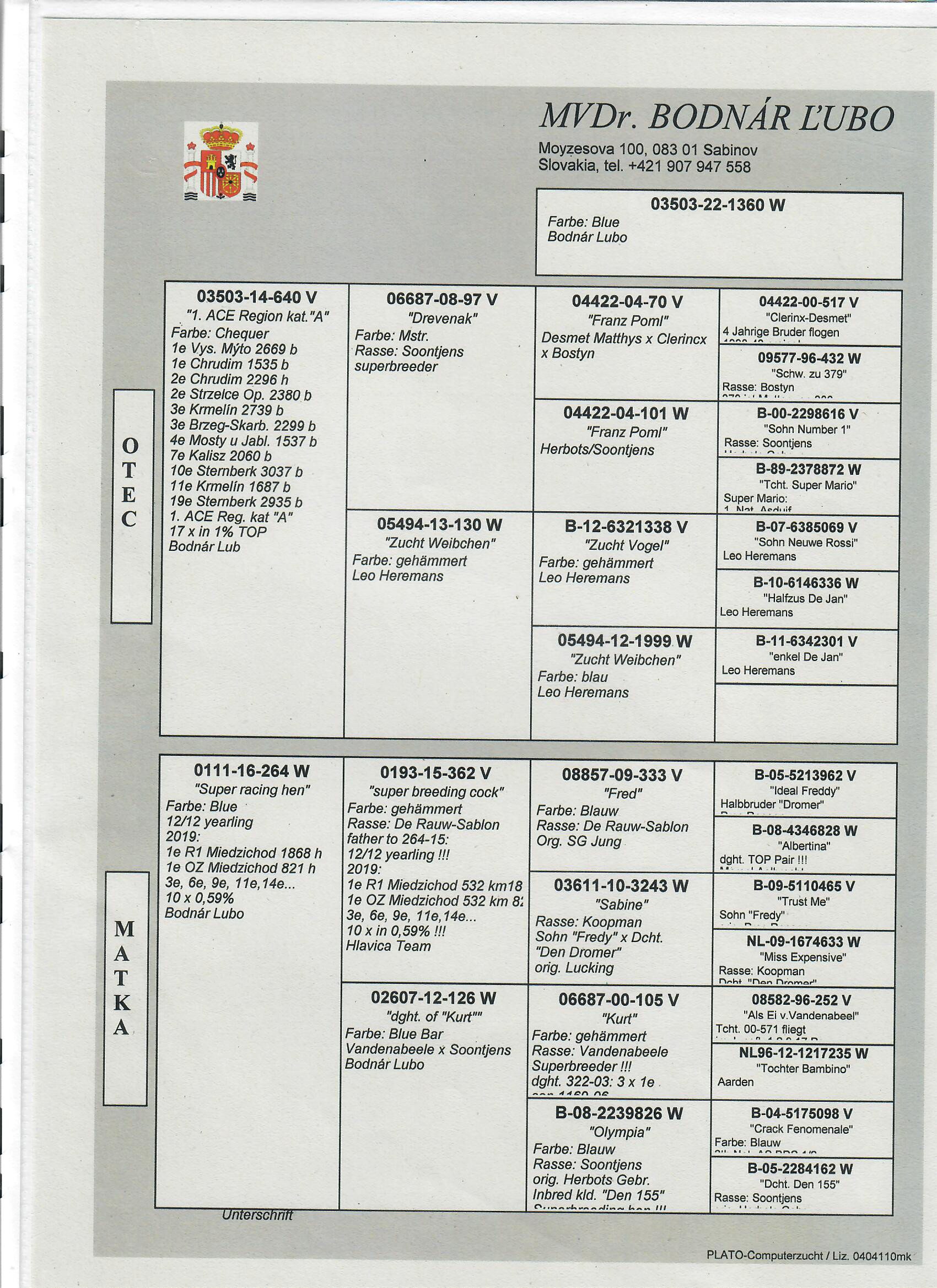Úvod · Aukcie · MVDr Ľubomír BodnárMVDr Ľubomír BodnárZdravím všetkých chovateľov a priaznivcov poštových holubov. Chcem vás pozvať na totálnu dražbu všetkých holubov, ktoré na holubníkoch mám. Veľmi nerád, ale po 55tich rokoch práce s holubami zo zdravotných dôvodov to musím urobiť, nemôžem sa už o nich starať ako by si zaslúžili, a tak to prenechám mladším chovateľom, ktorí budú mať záujem. V ponuke budú odchovy z najlepších línií na domáce súťaže, na preteky v testovačkách i chovné originály. Dražba prebehne v niekoľkých kolách postupne, možno nechám ešte vychovať zopár mláďát z najlepších párov a môžem ich pozdejšie ponúknuť tiež. Výkričné ceny sú symbolické a samozrejme nevyjadrujú skutočnú hodnotu holubov. Uvítal by som osobný odber, ale na doprave sa vieme dohodnúť. tel: 0907/947558 Počet holubov: 24 Priemerná cena dražených holubov: 49.00 € Upozornenie: Pre účasť v aukciách je potrebné byť prihlásený Prihlásiť sa |
