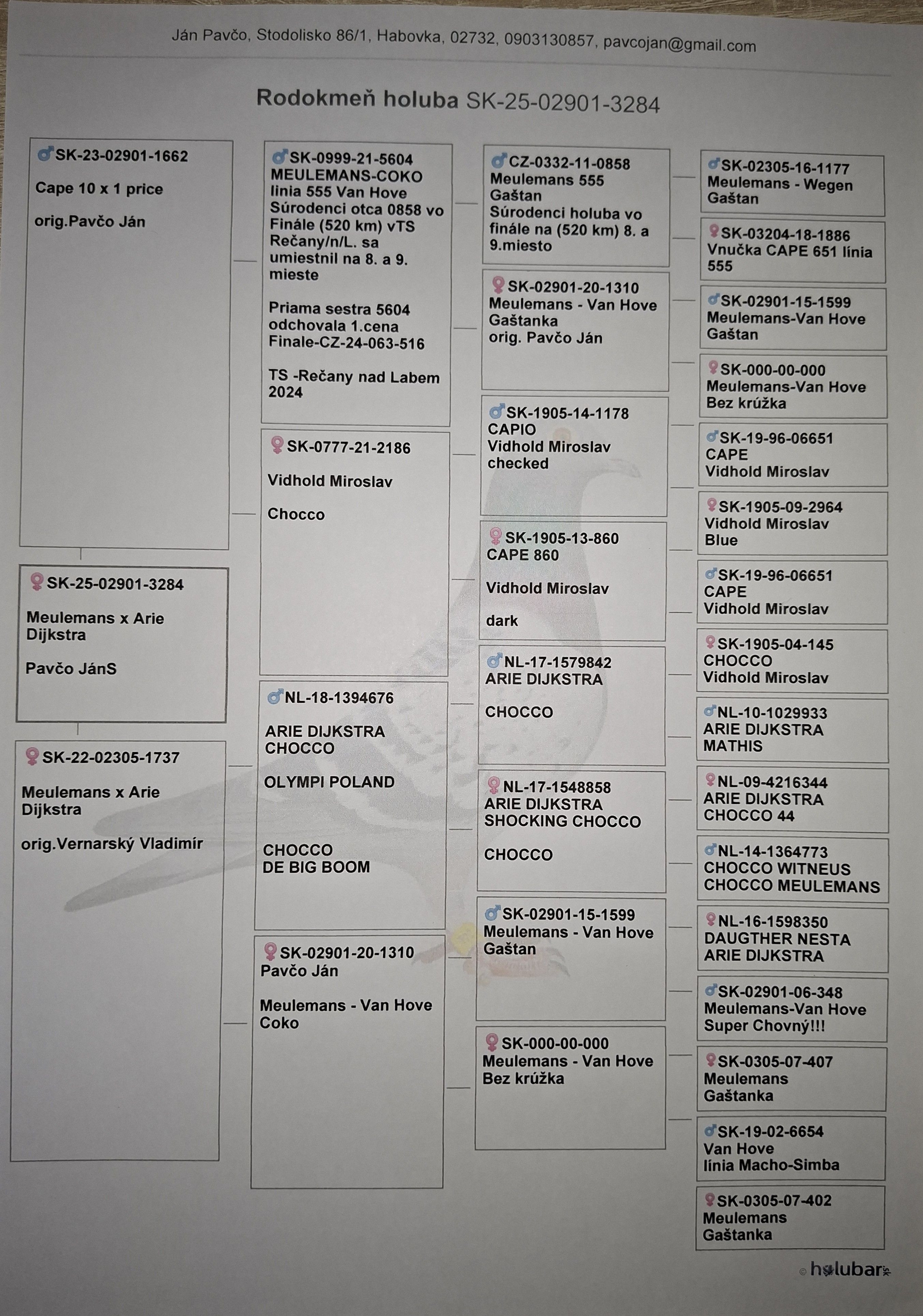 Pozdravujem všetkých chovateľov poštových holubov.Niekoľko násobný Generálny majster Oravy,krátke,stredné ,dlhé trate.Majster Regionu Orava+Liptov cca 220 chovateľov na koeficient .Z línie Baronka 1010 x 5555 vyhrala holubica národný pretek "HAMM 2023 , 885 KM" , ktorá nalietala cez 20 000 km v 20%. Veľa iných úspechov u iných chovateľov.Holuby boli preliečené , zaočkované Kolumba 2. ".Rozvoz holubov zabezbečím po hlavnej trase Žilina,Bratislava-Žilina,Košice po dohode s chovateľmi . Doprava za holuba 5 Eur !!!! Do ČR je možnosť poslať Zoo kurierom. Kontak tel.0903130857 Holuby sú vo výbornej kondícií pripravené na párenie!!!