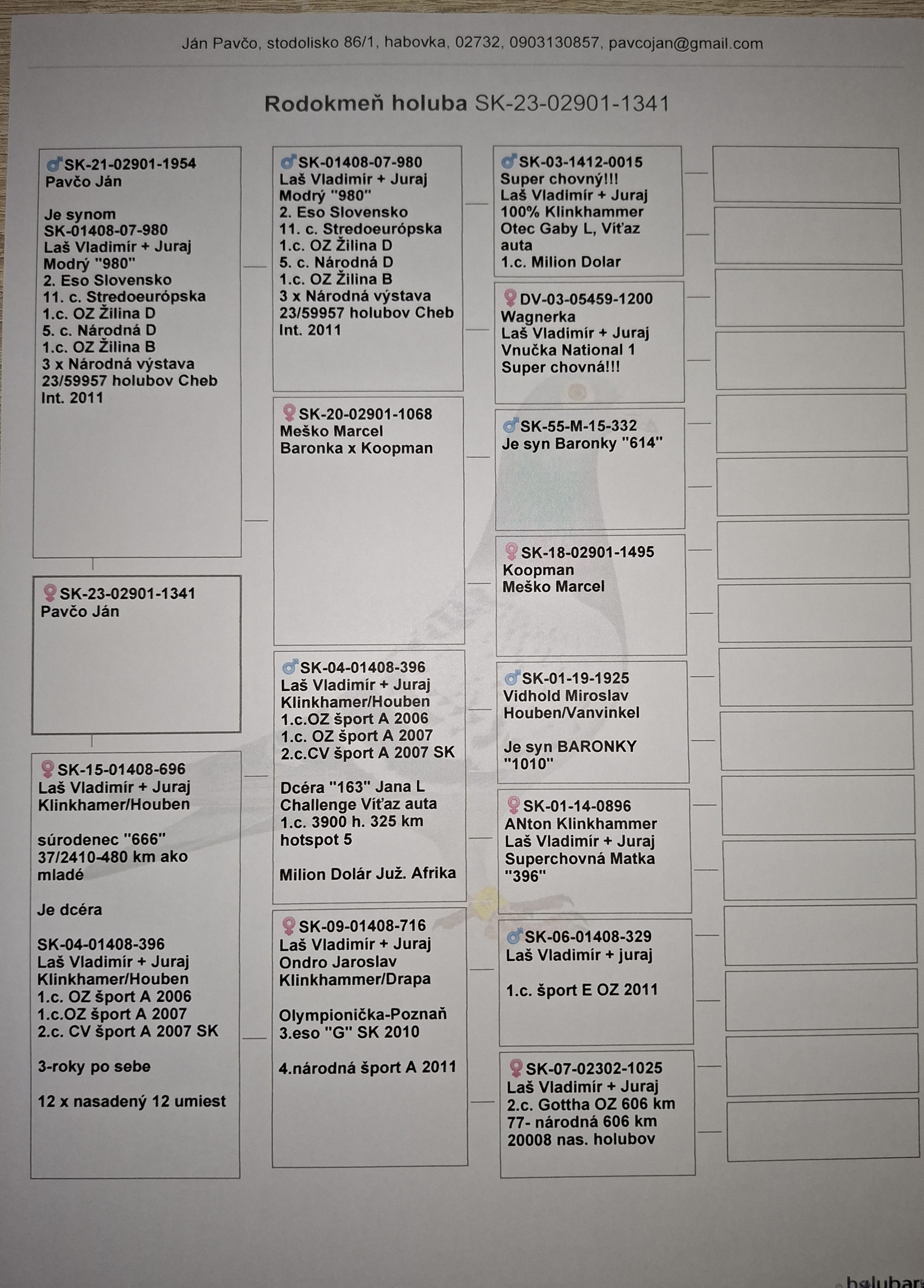 Pozdravujem všetkých chovateľov poštových holubov.Niekoľko násobný Generálny majster Oravy,krátke,stredné ,dlhé trate.Majster Regionu Orava+Liptov cca 220 chovateľov na koeficient .Z línie Baronka 1010 x 5555 vyhrala holubica národný pretek "HAMM 2023 , 885 KM" , ktorá nalietala cez 20 000 km v 20%. Veľa iných úspechov u iných chovateľov.Holuby boli preliečené , zaočkované Kolumba 2. ".Rozvoz holubov zabezbečím po hlavnej trase Žilina,Bratislava-Žilina,Košice po dohode s chovateľmi . Doprava za holuba 5 Eur !!!! Do ČR je možnosť poslať Zoo kurierom. Kontak tel.0903130857 Holuby sú vo výbornej kondícií pripravené na párenie!!!