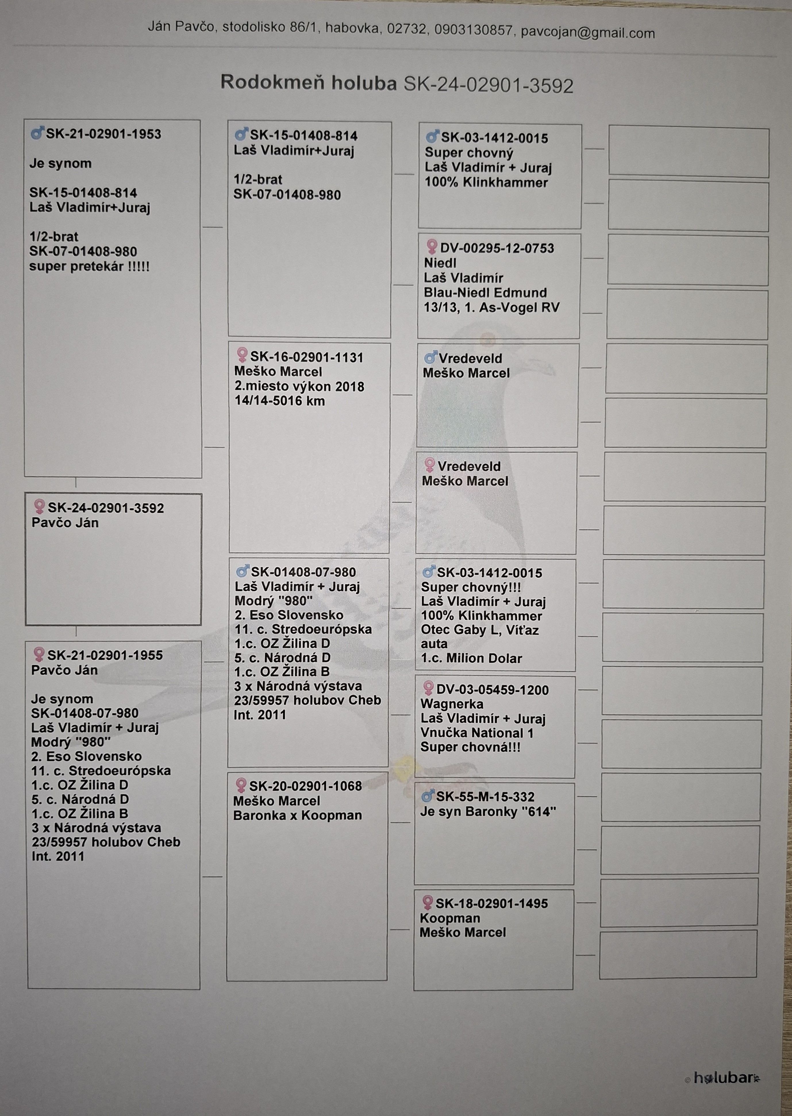 Pozdravujem všetkých chovateľov poštových holubov.Niekoľko násobný Generálny majster Oravy,krátke,stredné ,dlhé trate.Majster Regionu Orava+Liptov cca 220 chovateľov na koeficient .Z línie Baronka 1010 x 5555 vyhrala holubica národný pretek "HAMM 2023 , 885 KM" , ktorá nalietala cez 20 000 km v 20%. Veľa iných úspechov u iných chovateľov.Holuby boli preliečené , zaočkované Kolumba 2. ".Rozvoz holubov zabezbečím po hlavnej trase Žilina,Bratislava-Žilina,Košice po dohode s chovateľmi . Doprava za holuba 5 Eur !!!! Do ČR je možnosť poslať Zoo kurierom. Kontak tel.0903130857 Holuby sú vo výbornej kondícií pripravené na párenie!!!