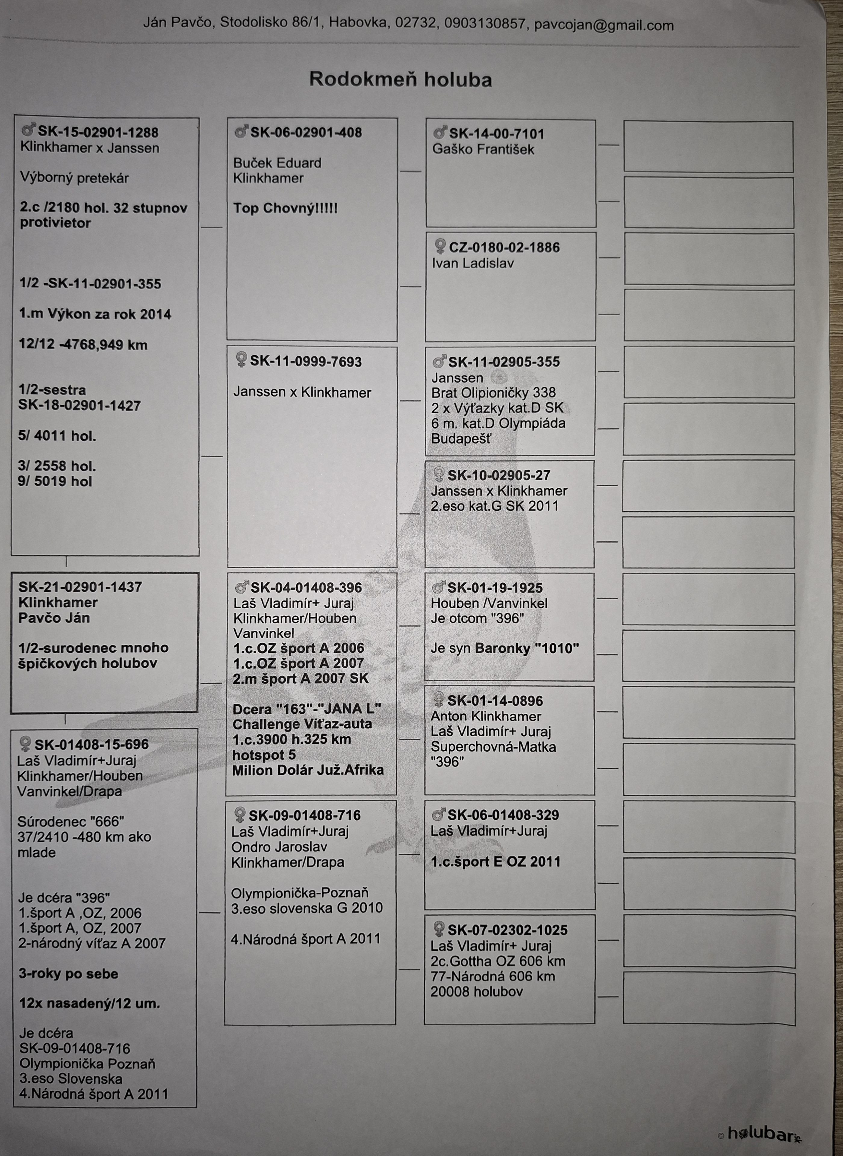Pozdravujem všetkých chovateľov poštových holubov.Niekoľko násobný Generálny majster Oravy,krátke,stredné ,dlhé trate.Majster Regionu Orava+Liptov cca 220 chovateľov na koeficient .Z línie Baronka 1010 x 5555 vyhrala holubica národný pretek "HAMM 2023 , 885 KM" , ktorá nalietala cez 20 000 km v 20%. Veľa iných úspechov u iných chovateľov.Holuby boli preliečené , zaočkované Kolumba 2. ".Rozvoz holubov zabezbečím po hlavnej trase Žilina,Bratislava-Žilina,Košice po dohode s chovateľmi . Doprava za holuba 5 Eur !!!! Do ČR je možnosť poslať Zoo kurierom. Kontak tel.0903130857 Holuby sú vo výbornej kondícií pripravené na párenie!!!