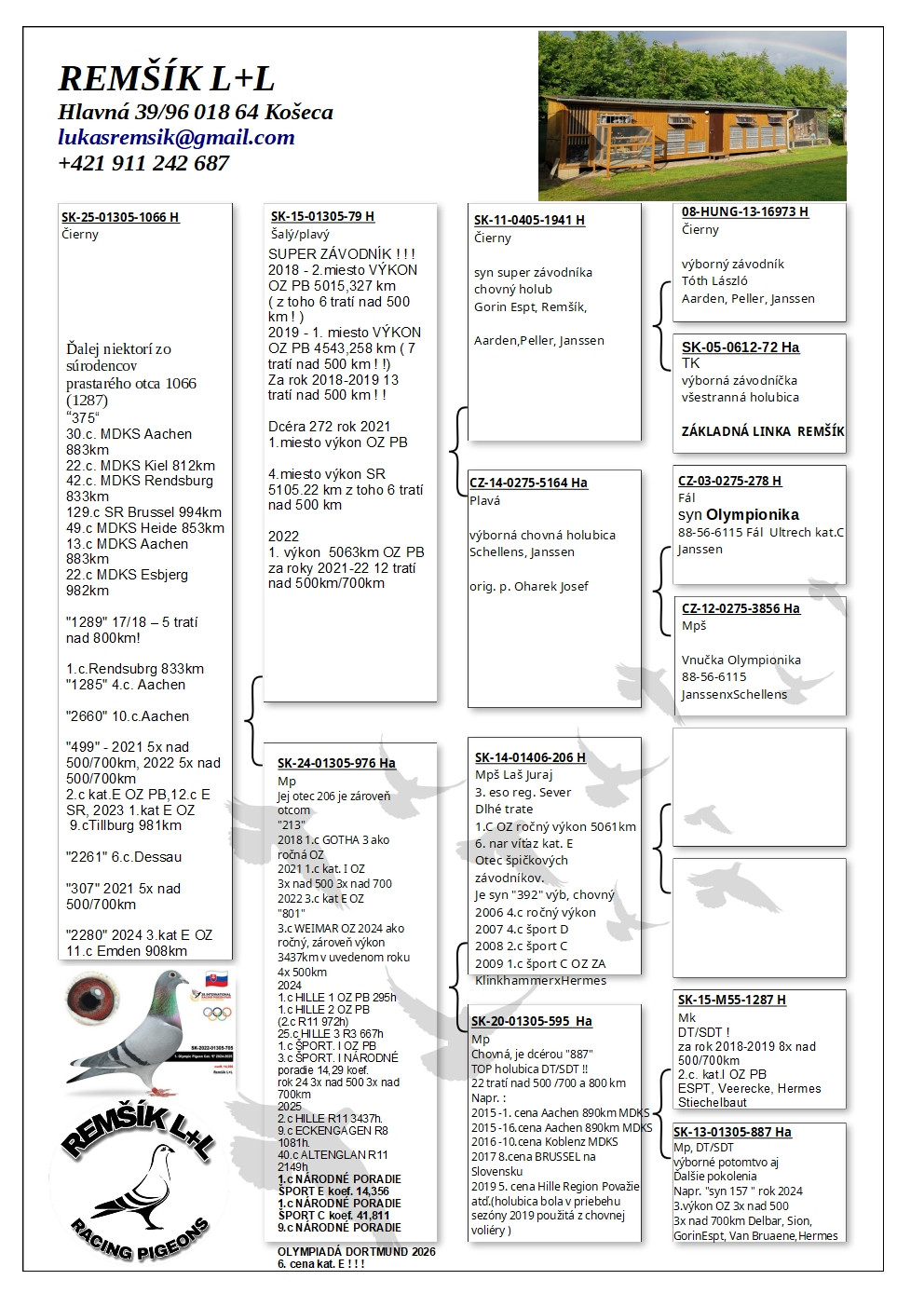 Vážení chovatelia pozývame Vás na aukciu z chovu dlhé roky smerovaného prímárne na dlhé trate. Ponúknuté sú holuby z overených línii, ďalej aj línia OLYMPIONIČKY 705, ktorá sa umiestnila na Olympiáde v Dortmunde v 2026 na 6. mieste kat.E. V roku 2025 SR 1.kat E aj C 9.kat.I, 2024 SR 3.kat I. Holuby sú kompletne preliečené. Vakcinácia Pharmavac Columbi 2 ešte len prebehne. Vydražené holuby, na trase ZA-BA bude spravený rozvoz v čo najskoršom termíne po ukončení aukcie, poplatok za dovoz 4€/ holub. Záujemcovia zo zahraničia prevzatie/dovoz vo vlastnej réžii napríklad cez privez-zvire.cz Záujemcovia mimo spomenutú trasu individuálna dohoda, ocením záujem aj druhej strany. Pevne veríme, že ponúkuté holuby budú prínosom pre Váš chov. DOPLNENÉ FOTOGRAFIE ! Lukáš Remšík +421 911 242 687 lukasremsik@gmail.com