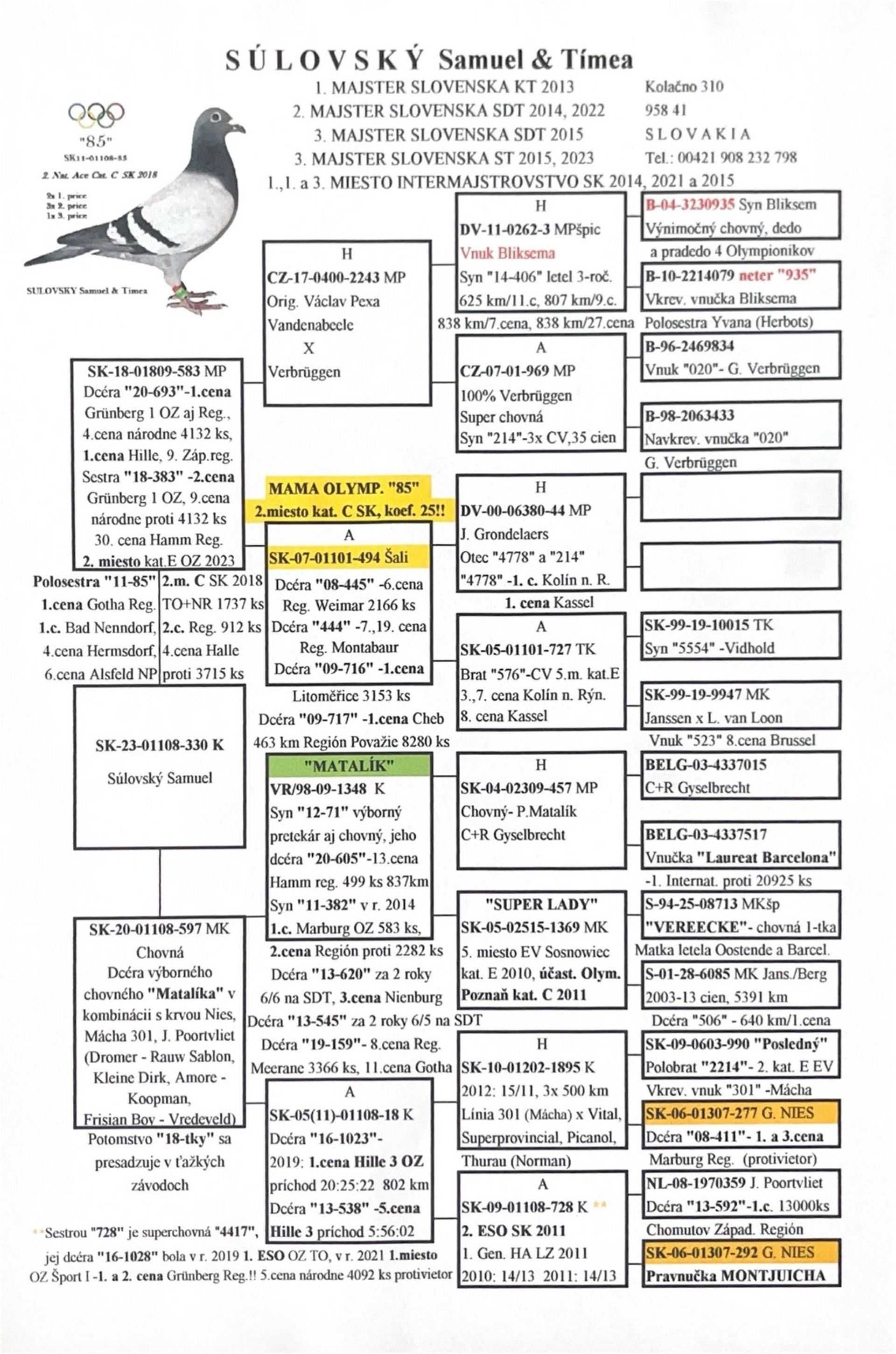 Popis: Súrodenec pozícia 10. Otec holuba je potomok našej top páry na SDTtrate ESPT,FABRY,VENUS,VEERECKE,HERMES,STIECHELBAUT Súrodenci 1,2,3 kat. E, Výborné umiestnenia na SDT/marat x Matka SABLON Mácha