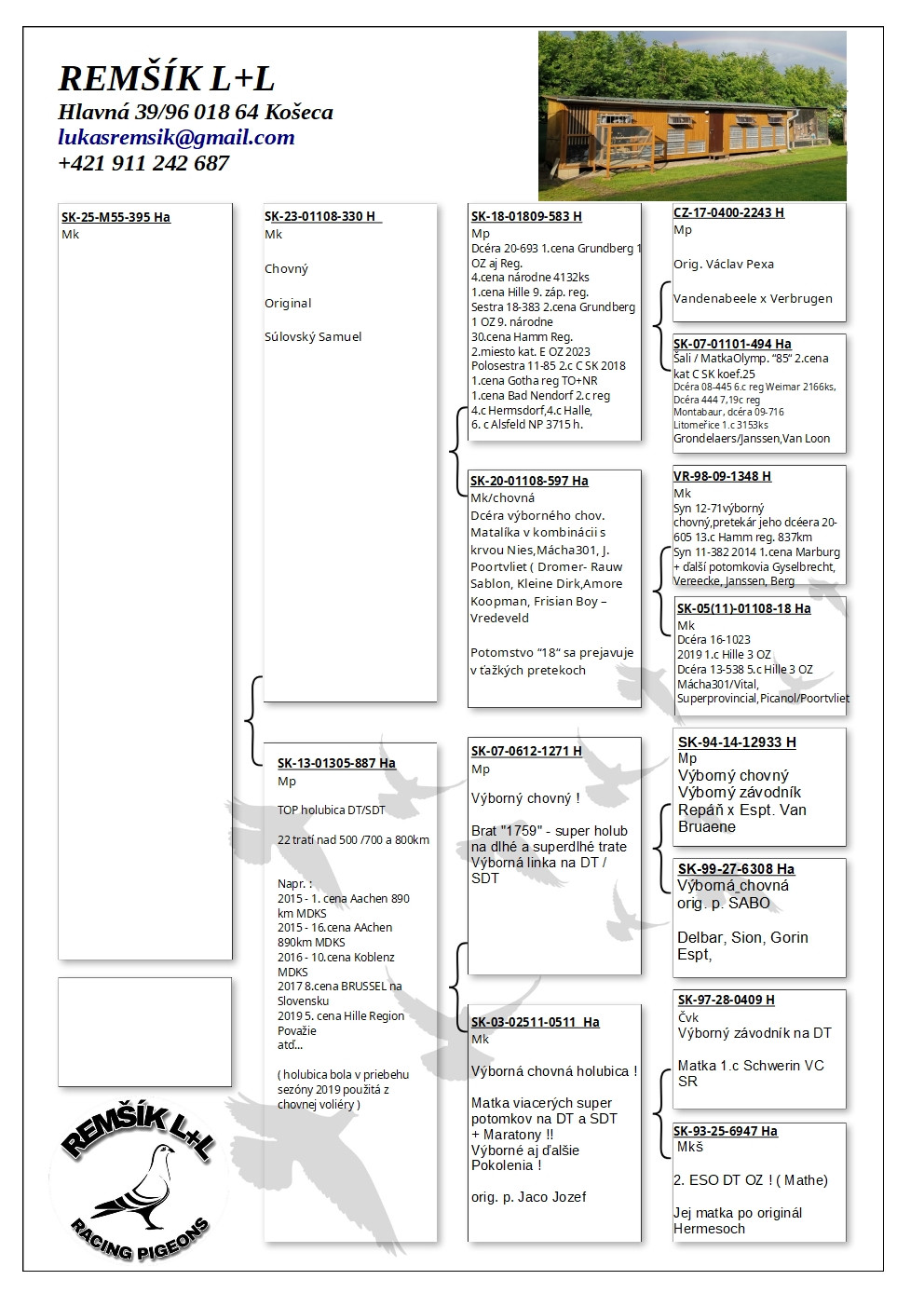 Vážení chovatelia pozývame Vás na aukciu z chovu dlhé roky smerovaného prímárne na dlhé trate. Ponúknuté sú holuby z overených línii, ďalej aj línia OLYMPIONIČKY 705, ktorá sa umiestnila na Olympiáde v Dortmunde v 2026 na 6. mieste kat.E. V roku 2025 SR 1.kat E aj C 9.kat.I, 2024 SR 3.kat I. Holuby sú kompletne preliečené. Vakcinácia Pharmavac Columbi 2 ešte len prebehne. Vydražené holuby, na trase ZA-BA bude spravený rozvoz v čo najskoršom termíne po ukončení aukcie, poplatok za dovoz 4€/ holub. Záujemcovia zo zahraničia prevzatie/dovoz vo vlastnej réžii napríklad cez privez-zvire.cz Záujemcovia mimo spomenutú trasu individuálna dohoda, ocením záujem aj druhej strany. Pevne veríme, že ponúkuté holuby budú prínosom pre Váš chov. DOPLNENÉ FOTOGRAFIE ! Lukáš Remšík +421 911 242 687 lukasremsik@gmail.com