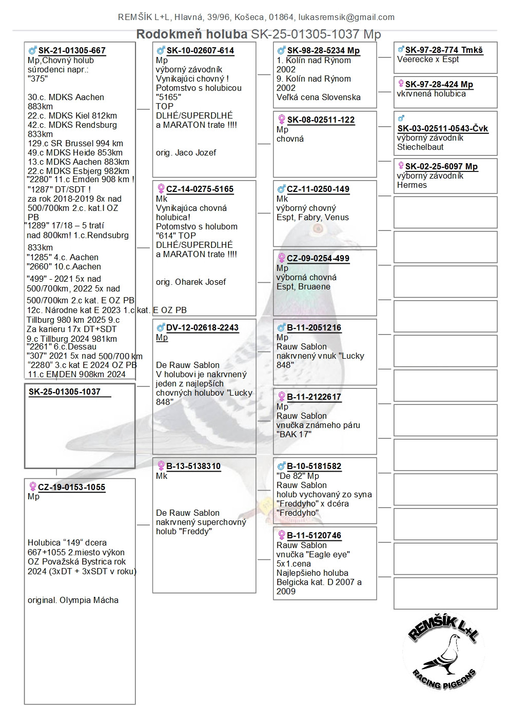 Popis: súrodenec pozície 13. OTEC je synom holuba 3.kat. I, potomok našej top páry na SDT trate 1,2,3 kat.E Espt, Fabry, Venus, Veerecke,Hermes Stiechelbaut a holubice 887 22x nad 500 km.Matka je 5164 Oharek Josef jej syn 1/2 Výkon 13x nad 500km za dva roky