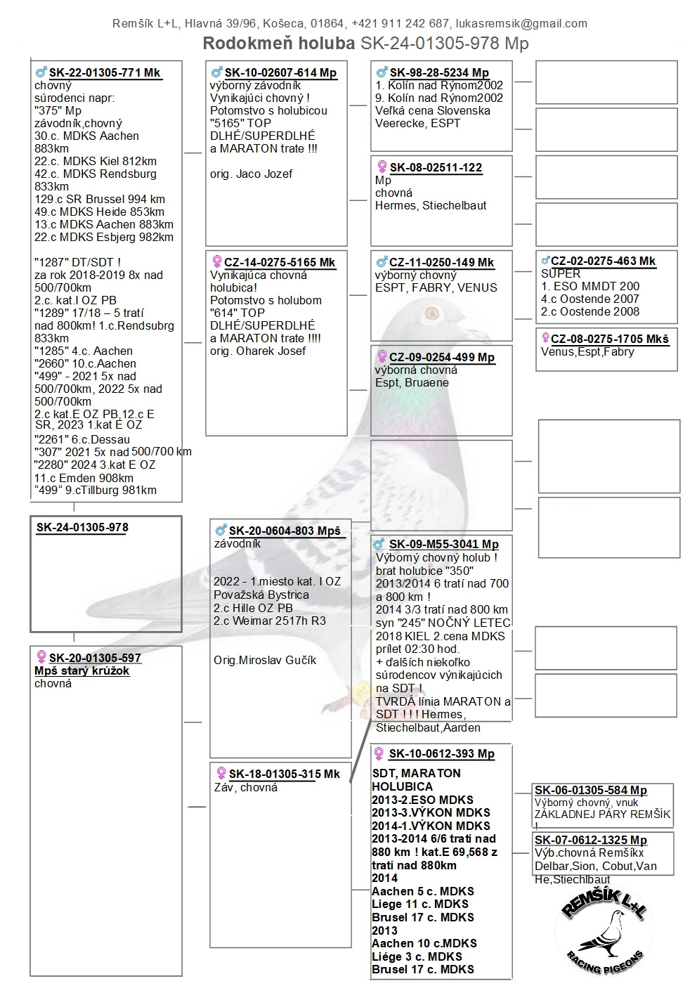 Popis: súrodenec pozície 13. OTEC je synom holuba 3.kat. I, potomok našej top páry na SDT trate 1,2,3 kat.E Espt, Fabry, Venus, Veerecke,Hermes Stiechelbaut a holubice 887 22x nad 500 km.Matka je 5164 Oharek Josef jej syn 1/2 Výkon 13x nad 500km za dva roky