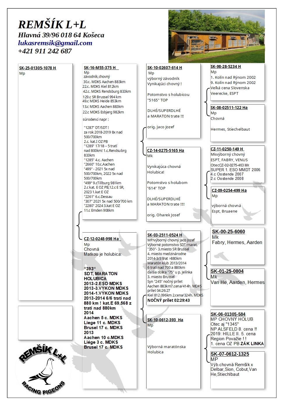 Vážení chovatelia pozývame Vás na aukciu z chovu dlhé roky smerovaného prímárne na dlhé trate. Ponúknuté sú holuby z overených línii, ďalej aj línia OLYMPIONIČKY 705, ktorá sa umiestnila na Olympiáde v Dortmunde v 2026 na 6. mieste kat.E. V roku 2025 SR 1.kat E aj C 9.kat.I, 2024 SR 3.kat I. Holuby sú kompletne preliečené. Vakcinácia Pharmavac Columbi 2 ešte len prebehne. Vydražené holuby, na trase ZA-BA bude spravený rozvoz v čo najskoršom termíne po ukončení aukcie, poplatok za dovoz 4€/ holub. Záujemcovia zo zahraničia prevzatie/dovoz vo vlastnej réžii napríklad cez privez-zvire.cz Záujemcovia mimo spomenutú trasu individuálna dohoda, ocením záujem aj druhej strany. Pevne veríme, že ponúkuté holuby budú prínosom pre Váš chov. DOPLNENÉ FOTOGRAFIE ! Lukáš Remšík +421 911 242 687 lukasremsik@gmail.com