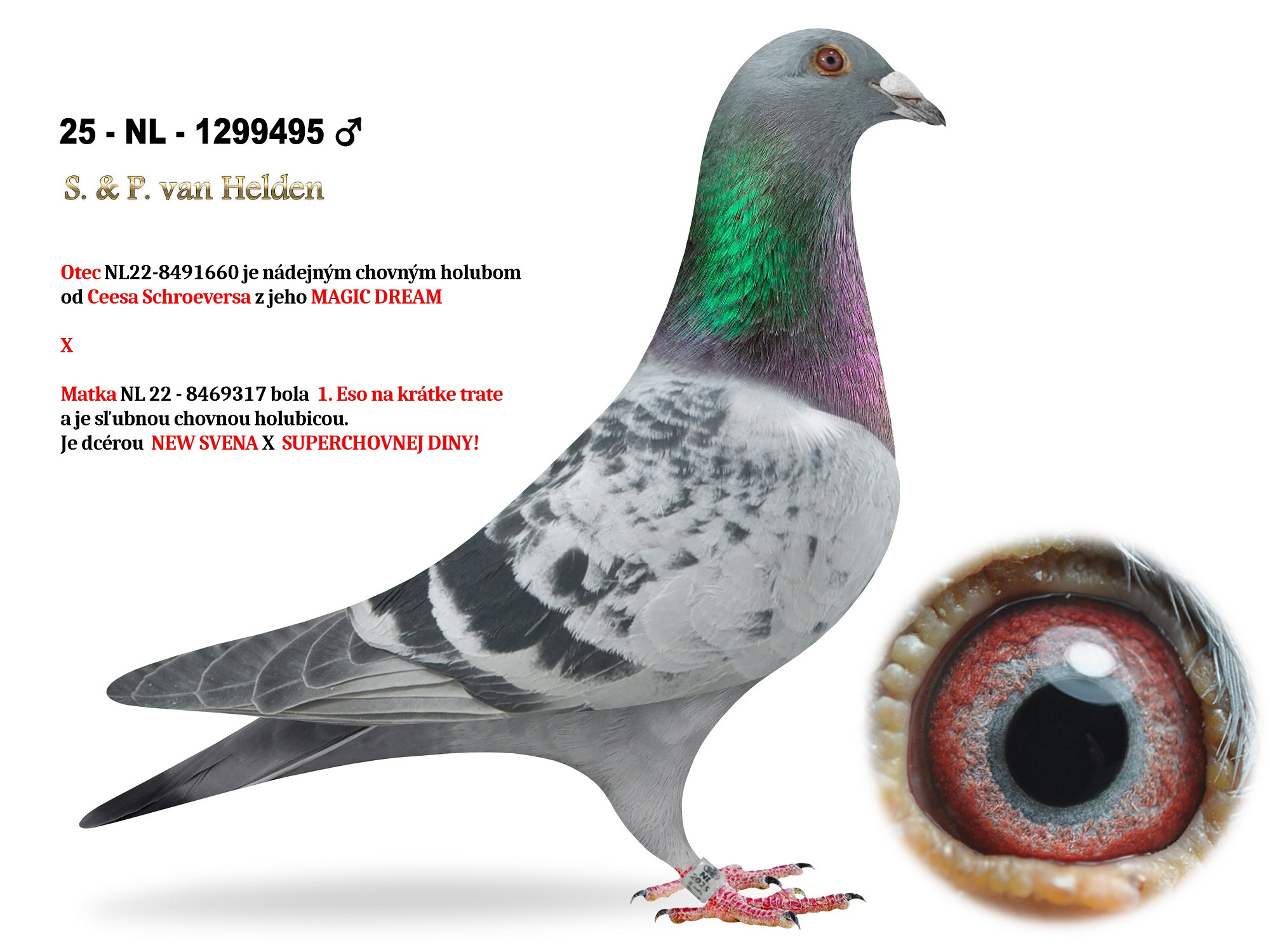 Otec NL22-8491660 je nádejným chovným holubom od Ceesa Schroeversa z jeho MAGIC DREAM, originálneho holuba G.&S. Verkerk z ich najlepších holubov! V spojení s FAST LADY je veľmi dobrou chovnou holubicou u Ceesa Schroeversa, pôvodom zo slávneho Gebr. Scheele!