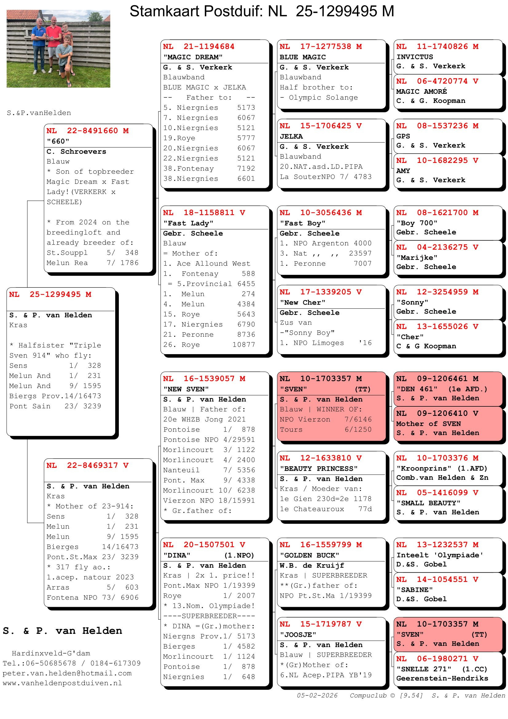 Sim a Peter van Heldenovci majú skvelý kmeň holubov, ktorý dosahoval vynikajúce výsledky na pretekoch na 100-700 km, vybudovaný ich slávnom ZÁKLADNÝM holubovi „SVEN“. V chovnom holubníku nájdete jeho potomkov, napríklad: PATRIOT, DINA, SVEN JUNIOR, GP502, JOOSJE, CHER AMI! Okrem SVENA má zlatý prínos pre holubník aj „GOLDEN BUCK“, je to brat „SABINE 1“, prvého národného esa KBDB na malých stredných tratiach. Ešte pôsobivejšie sú však výsledky ako chovného holuba samotného GOLDEN BUCKA v chovnom holubníku Sima a Petra! V KANNIBALINE majú ZLATÚ chovnú samicu, ktorá perfektne ladí so SVENOM aj GOLDEN BUCKOM!! Spolu so SVENOM to viedlo k niekoľkým ÚŽASNÝM SUPER PRETEKÁROM a CHOVNÝM holubom ako PATRIOT, BETH a SVEN JUNIOR, viacnásobne overené holuby na pretekoch aj v chovnom holubníku! Ich cieľom je a vždy bolo vybudovať VŠESTRANNÝ (100 – 700 km) kmeň vynikajúcich špičkových holubov. Hľadať SUPER holuby, krížiť ich medzi sebou a vrátiť najlepšie výkonné potomstvo späť do chovu, s výsledkom ešte lepších holubov! Výsledkom bolo niekoľko víťazstiev na provincionálnych/celoštátnych pretekoch a množstvo skvelých referencií inde. To ukazuje, že títo chovatelia holubov majú to NAJLEPŠIE z NAJLEPŠÍCH v pretekoch holubov v Holandsku. Týždeň čo týždeň súťažia s najlepšími chovateľmi Holandska, ako sú: Willem de Bruin, G. a S. Verkerk, Peter van de Merwe atď. V roku 2024 vyhrali 2. majstrovstvá mladých holubov v Južnom Holandsku proti Willemovi de Bruinovi, G. a S. Verkerkovi, Peterovi van de Merwe atď.