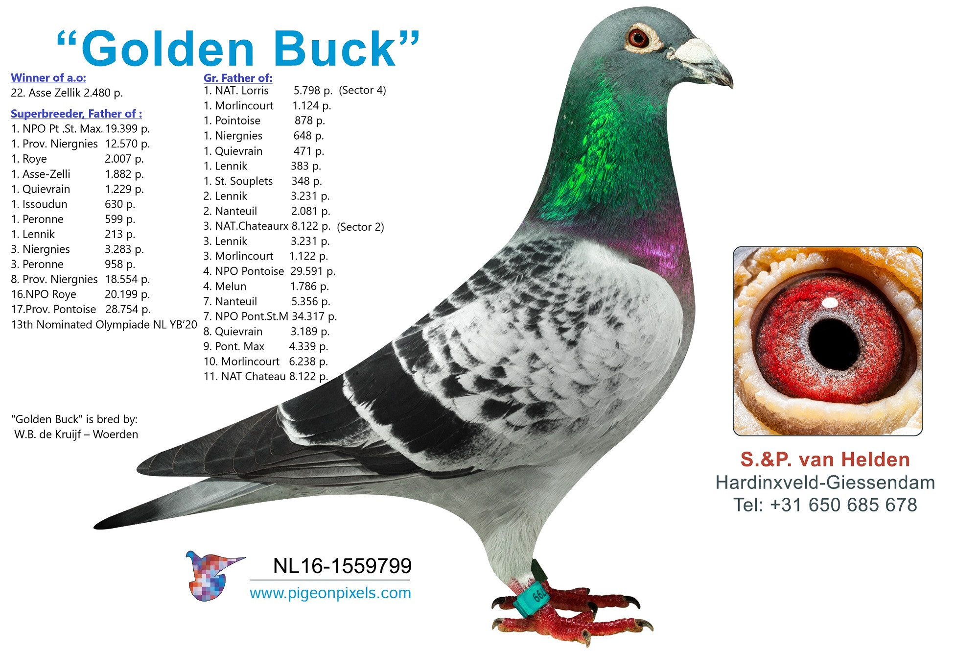 Otec NL24-8422153 je synom GOLDEN BUCK a CHRISTA. 153 je víťazom 92.ceny National Issoudun 7.323. GOLDEN BUCK je SUPERchovný holub! Otec a starý otec viacerých víťazov NAT/NPO/provinčných pretekov!!
