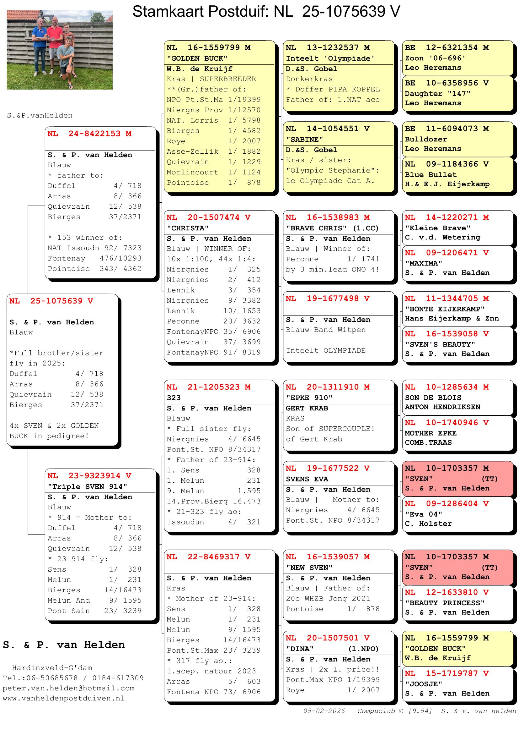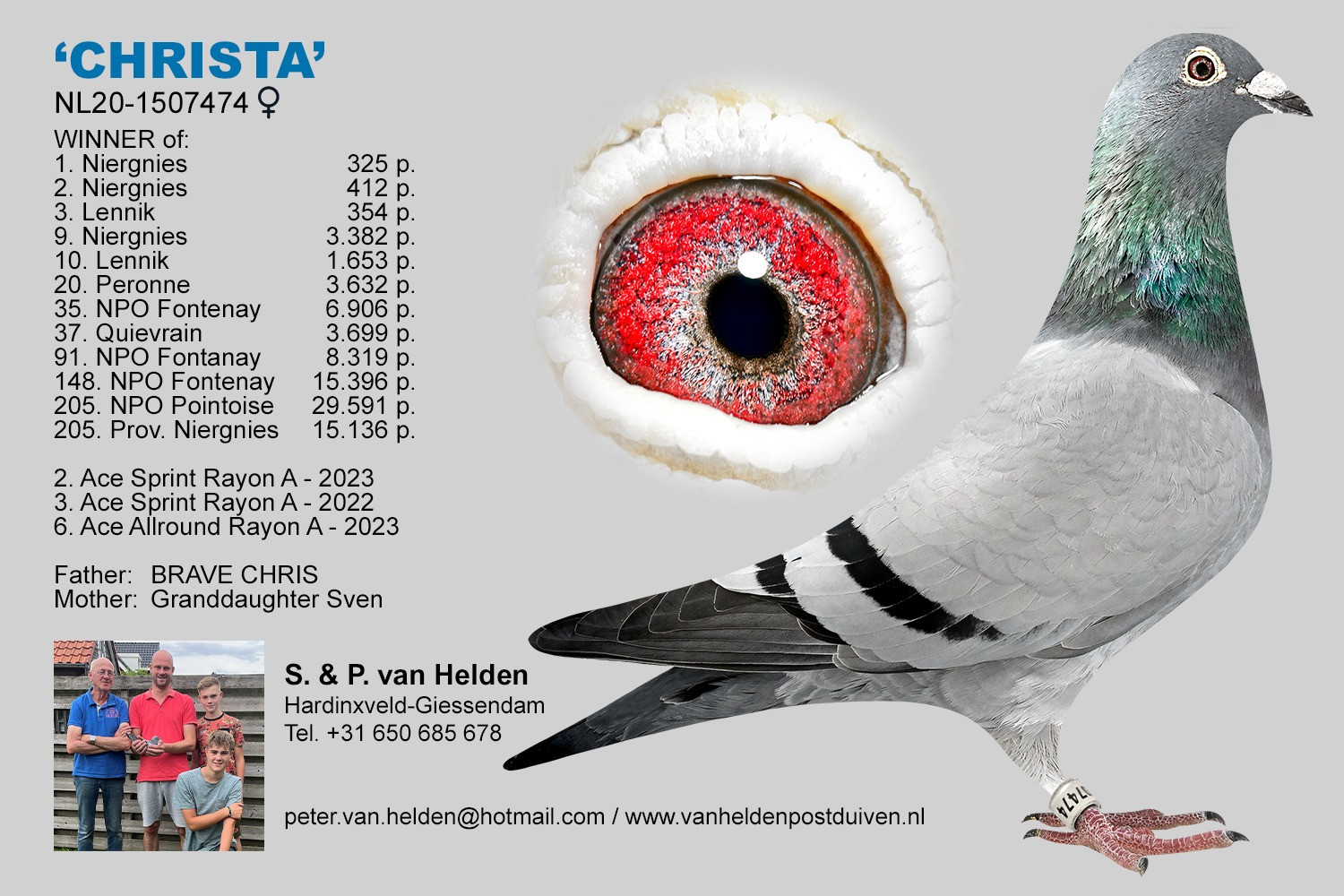 Sim a Peter van Heldenovci majú skvelý kmeň holubov, ktorý dosahoval vynikajúce výsledky na pretekoch na 100-700 km, vybudovaný ich slávnom ZÁKLADNÝM holubovi „SVEN“. V chovnom holubníku nájdete jeho potomkov, napríklad: PATRIOT, DINA, SVEN JUNIOR, GP502, JOOSJE, CHER AMI! Okrem SVENA má zlatý prínos pre holubník aj „GOLDEN BUCK“, je to brat „SABINE 1“, prvého národného esa KBDB na malých stredných tratiach. Ešte pôsobivejšie sú však výsledky ako chovného holuba samotného GOLDEN BUCKA v chovnom holubníku Sima a Petra! V KANNIBALINE majú ZLATÚ chovnú samicu, ktorá perfektne ladí so SVENOM aj GOLDEN BUCKOM!! Spolu so SVENOM to viedlo k niekoľkým ÚŽASNÝM SUPER PRETEKÁROM a CHOVNÝM holubom ako PATRIOT, BETH a SVEN JUNIOR, viacnásobne overené holuby na pretekoch aj v chovnom holubníku! Ich cieľom je a vždy bolo vybudovať VŠESTRANNÝ (100 – 700 km) kmeň vynikajúcich špičkových holubov. Hľadať SUPER holuby, krížiť ich medzi sebou a vrátiť najlepšie výkonné potomstvo späť do chovu, s výsledkom ešte lepších holubov! Výsledkom bolo niekoľko víťazstiev na provincionálnych/celoštátnych pretekoch a množstvo skvelých referencií inde. To ukazuje, že títo chovatelia holubov majú to NAJLEPŠIE z NAJLEPŠÍCH v pretekoch holubov v Holandsku. Týždeň čo týždeň súťažia s najlepšími chovateľmi Holandska, ako sú: Willem de Bruin, G. a S. Verkerk, Peter van de Merwe atď. V roku 2024 vyhrali 2. majstrovstvá mladých holubov v Južnom Holandsku proti Willemovi de Bruinovi, G. a S. Verkerkovi, Peterovi van de Merwe atď.