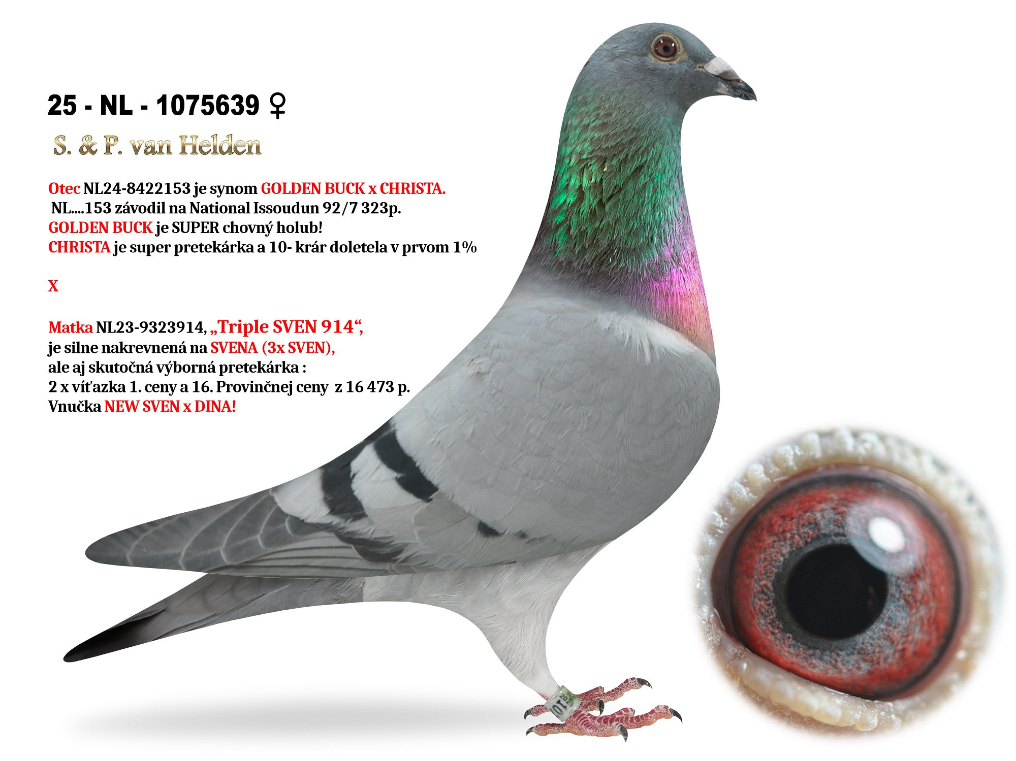 Matka NL23-9323914, „Triple SVEN 914“, je silne inbredovaná na SVEN (3x SVEN), ale aj skutočná výborná pretekárka : 2 x víťazka 1. ceny a 16. Provinčnej ceny  z 16 473 holubov! Vnučka NEW SVEN & DINA!