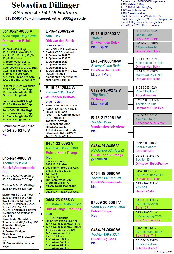 Sebastian Dillinger je mladý chovatel z Bavorska, který spolupracuje s Josefem Kusserem, společně cestují po těch nejlepších holubnících v Německu, Belgii i Holandsku. Posily má jak od Josefa Kussera tak originály např. od Albert Derwa, G. Fröhlingsdorf a Flanders Collection-Yannick De Ridder linie Dirk van den Bulck, ale i z TOP chovu PIPA Elite Center nebo SG Steffl , Will a Falco Ebben !!!