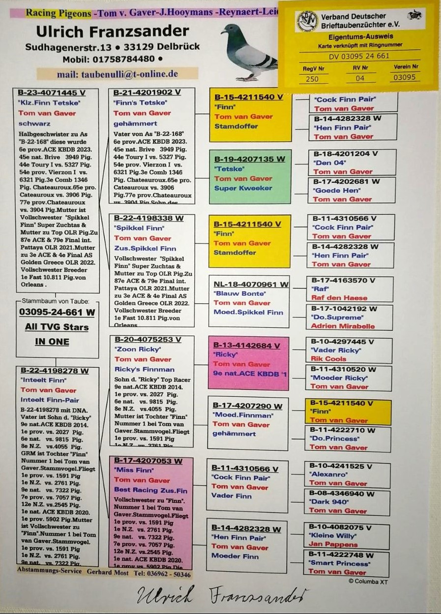 Ide o výnimočnú kombináciu na strane otca PRINCE PORSCHE / LEIDEMAN´S GEBr. & na strane matky 100 % TOM VAN GAVER – FINN & RICKY.