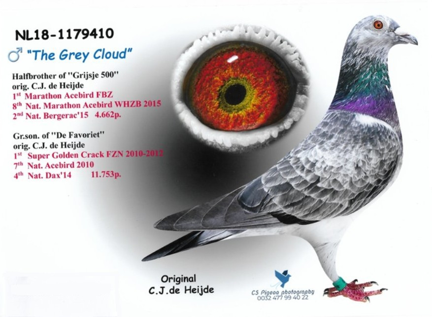 Holub „GREY CLOUD“ je potomok takých super holubov od COR DE HEIJDE ako: MOOI GRIJS, DE FAVORIET, BEAUTY, GEJA, INGRID. Holub „GREY CLOUD“ je polobrat holuba GRIJSJE 500, ktorý bol: