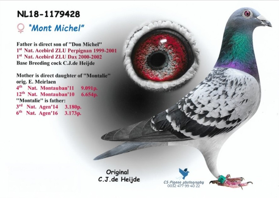 Holubica „MONT MICHEL“ je matkou holuba „SWEET 69“, ktorý dokázal v roku 2021 vyhrať z preteku Narbonne, 875 km. Je produktom párenia Syna DON MICHEL x Vnučka DON MICHEL, obohatené o holuby od Meirlaen Etienne ( MONTALIE, YELENA ).