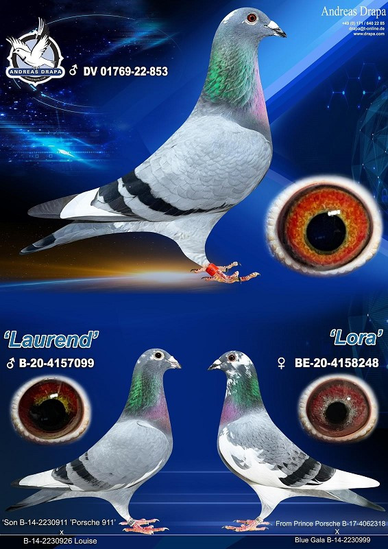 Na strane matky máme holubicu „LORA“, ktorá pochádza z párenia holuba „PRINCE PORSCHE“ a holubice „BLUE GALA“. Obaja rodičia sú súrodenci, rodičov holuba „LAUREND“, čiže „PRINCE PORSCHE“ je priamy brat holuba „PORSCHE 911“ a holubica „BLUE GALA“ je sestra národnej víťazky z Bourges, holubice „LOUISE“.