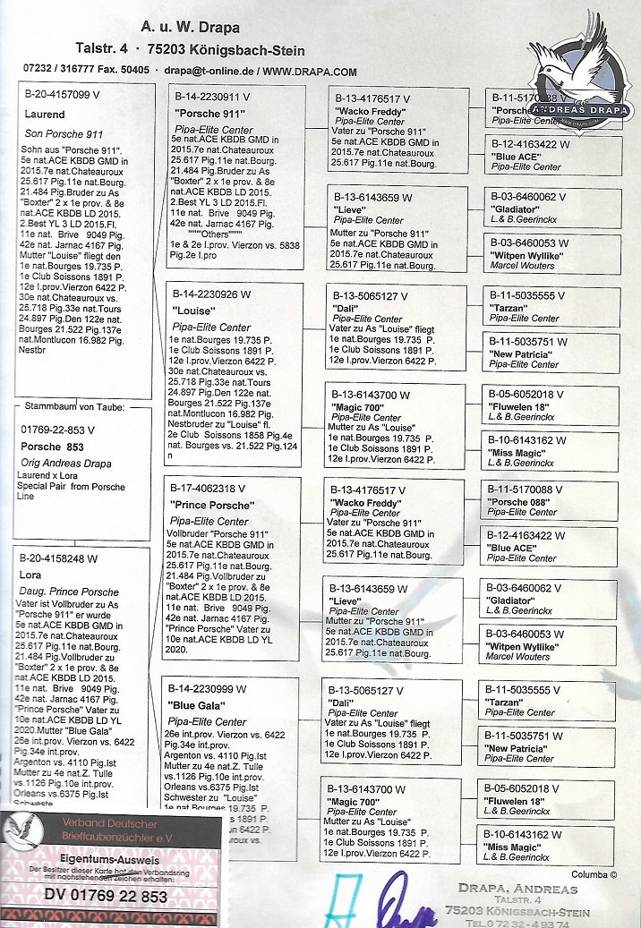 Foto rodokmeňu starého otca, holuba 853, vkrvnený vnuk PORSCHE 911, orig. A. u W. Drapa