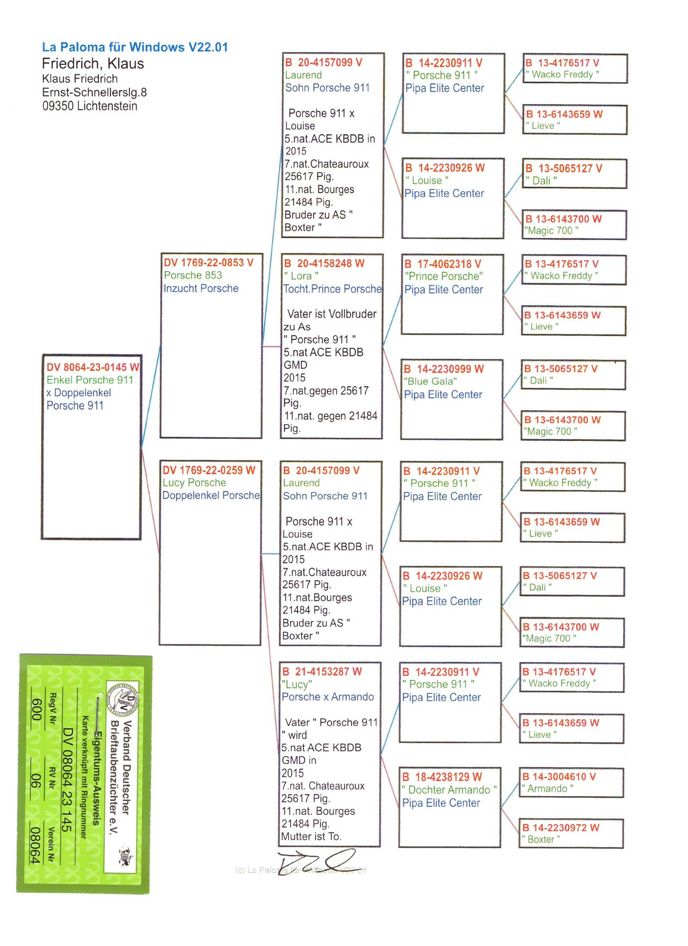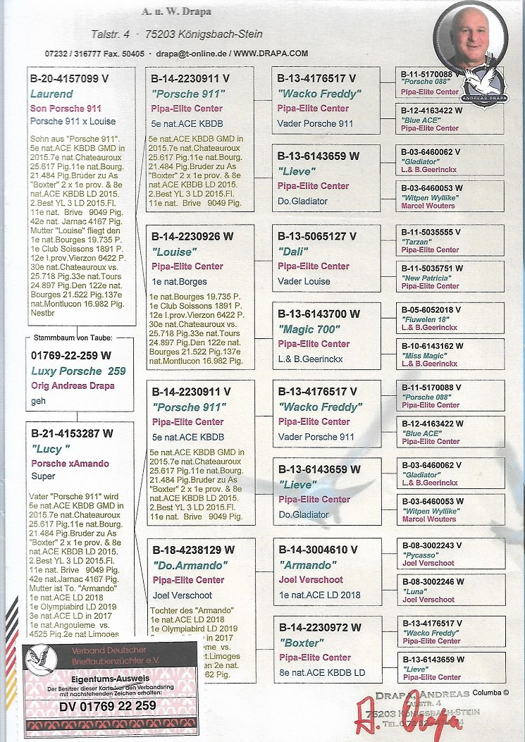 Foto rodokmeňu starej matky, holubice 259, vkrvnená vnučka PORSCHE 911, orig. A. u W. Drapa