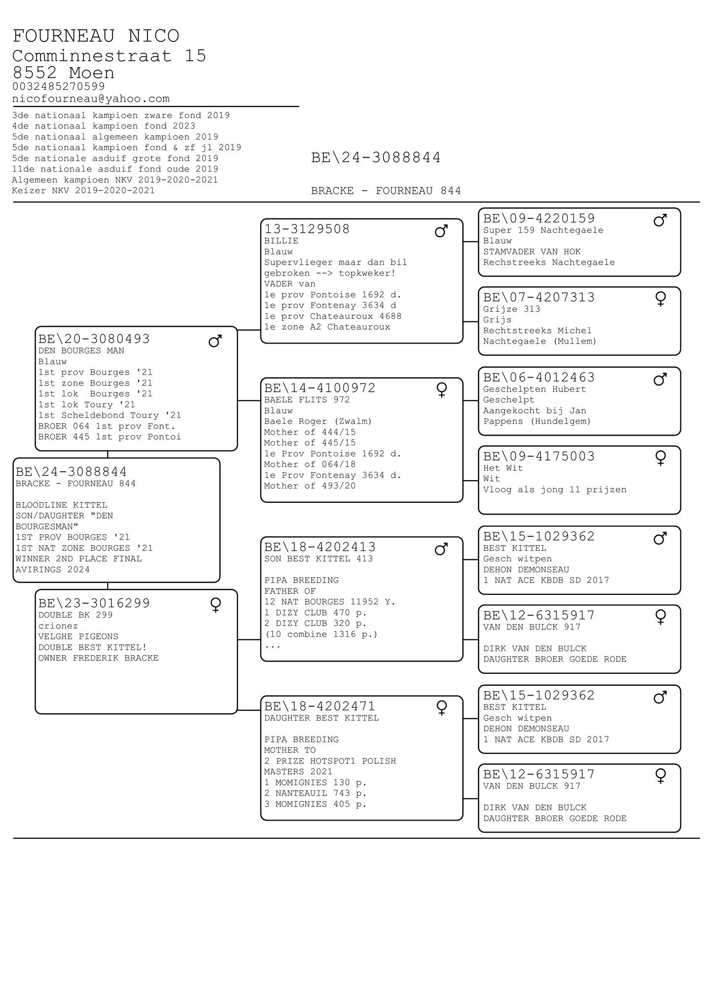 Popis: Posledný ponúkaný syn našej Zlatej Páry (VANDENABEELE). Priamy potomok TOP chovnej páry s veľkým množstvom víťazstiev.