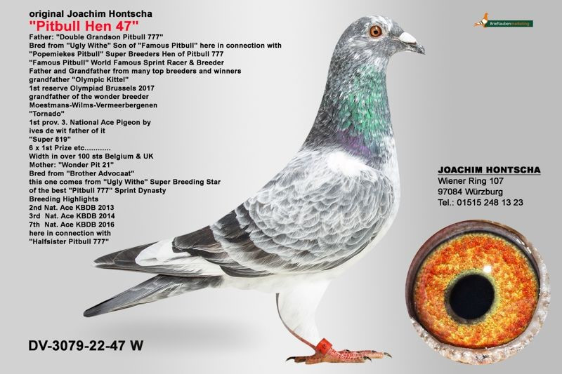Holubica „47“ pochádza z párenia holuba „428“ (=obojstranného vnuka holuba FAMOUS PITBULL 777) a holubice „398“ (=vnučky holuba Ugly Withe, syna FAMOUS PITBULL 777).