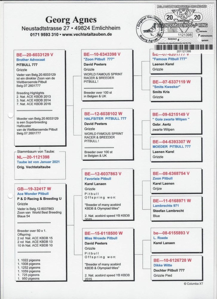 Otec holubice „398“ je Brother Advocaat z párenie Ugly Withe (syna PITBULLA 777) a polosestry holuba PITBULL 777. Matka holubice „398“ je Ace Wonder Pitbull, z párenia vnuka holuba PITBULL 777 a holubice Miss Wroede Pitbul, vnučky holuba PITBULL 777.