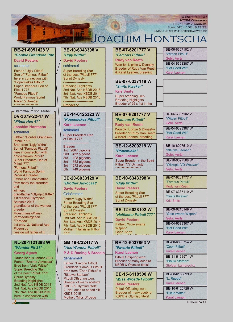 Otec holuba „428“ je holub Ugly Withe z párenia FAMOUS PITBULL 777 a holubice Smits Kweker. Rodina týchto dvoch super holubov má na konte veľmi veľa prvých cien ( PITBULL viac ako 100x, Smits Kweker viac ako 25x). Matka holuba Popemiekes Pitbull je z párenia FAMOUS PITBULL 777 a holubice Popemieke, super chovnej holubice z rodiny PITBULL 777.